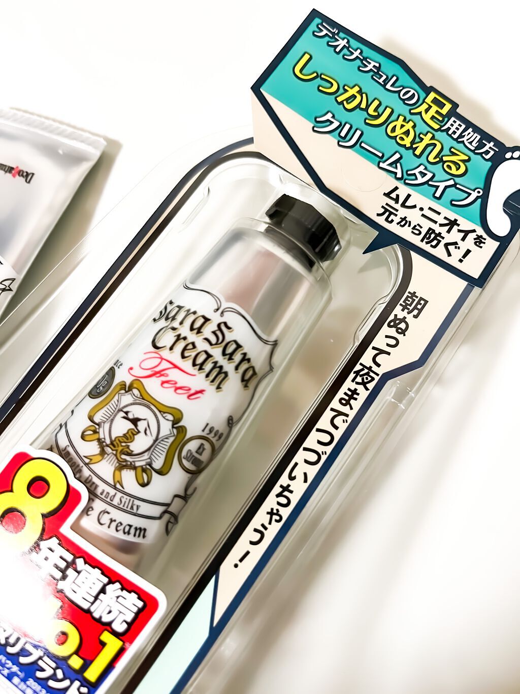 - \11年間ず~っと売上No.1*直ヌリ制汗デオドラントブランド/ 『防臭力のデオナチュレ』シリーズから、足特有のムレ・ニオイを防ぐ足用処方「薬用デオナチュレ足指さらさらクリーム」 ◆◆靴、脱ぐの⁈とドキッとすること、ありませんか?◆◆ 足は1日コップ約1杯分の汗をかき、ムレて、ニオイやすい だから、デオナチュレの足用でケア! ◆◆ユーザーから選ばれる理由◆◆ 1.天然アルム石に着目。有効成分「焼ミョウバン」を配合し、汗・ニオイを元から防ぐ! 足汗吸収さらさらパウダー**やティーツリーハーブ・ローズマリーエキス***を配合 2.ニオイの発生源に“直ヌリ”で、朝ぬって夜まで続いちゃう! 3.クリームなのに、ベタつかず・白残りしにくい ==注意== ●顔・粘膜を避け、除脱毛直後や肌に異常があるときは使用しないでください。●肌に異常が生じていないかよく注意してご使用ください。また、お肌に合わないとき、使用中に赤み、はれ、かゆみ、刺激、色抜け(白班等)や黒ずみ等の異常があらわれたときは、使用を中止し、皮フ科専門医などにご相談ください。●使用後はキャップをしっかり閉め、直射日光や高温多湿を避けて保管してください。●乳幼児の手の届かないところに置いてください。●床、靴、衣類などにつかないようご注意ください。 販売名:DN薬用フットクリームFc *インテージSRI+直ヌリ制汗剤市場(形状:ロールオン・スティック・クリーム・ジェル・パウダー) 2013年5月~2024年4月 デオナチュレシリーズ 累計販売金額 **基剤:無水ケイ酸 ***保湿成分