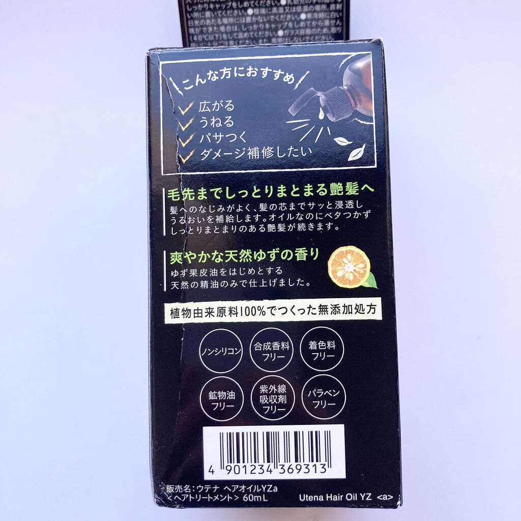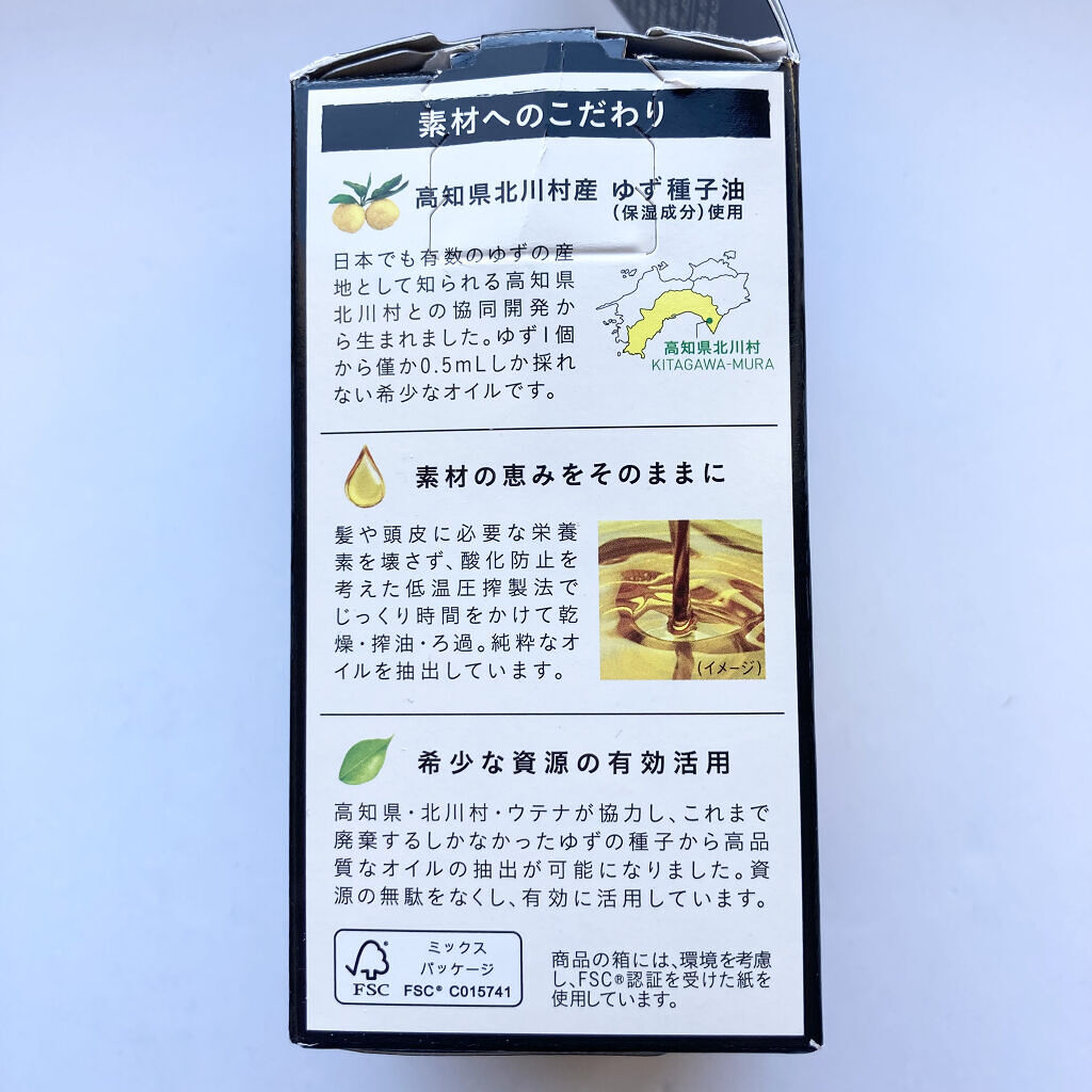 - 高知県北川村産ゆず種子油(保湿成分)使用の無添加*ヘアオイル。 ベタつかず、髪の芯までサッと浸透。広がる髪も毛先までしっとりまとまります。 爽やかな天然ゆずの香り。 *シリコーン・合成香料・着色料・鉱物油・紫外線吸収剤・パラベン不使用