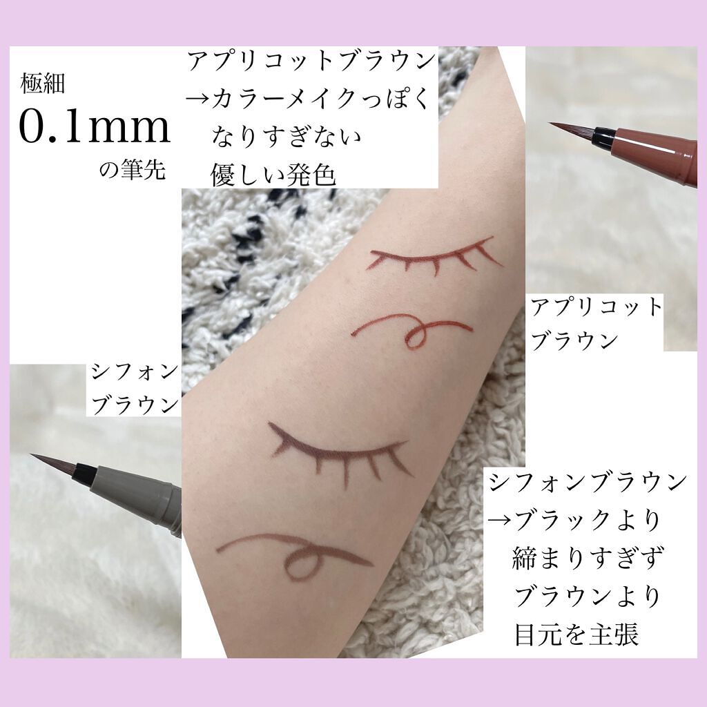 - 筆先までずっとなめらか、目尻で感動するリキッドアイライナー。 必要な量が肌にのる新設計で、まぶたの上をすべるような、滑らかな描き心地。しなやかでコシのある筆が、筆圧のコントロールを容易にし、太いラインも細いラインも思い通りに仕上げます。水、汗、涙に強いウォータープルーフタイプなのに、通常洗顔で簡単オフ。肌に色素が残らない顔料を使用。5種類の美容液成分を従来品の200%配合し、メイクしながら目元ケアまで。 ●ブラウンブラック ※2020年9月12日 バラエティショップ先行発売 ●漆黒ブラック ※2020年12月頃発売予定 ●ナチュラルブラウン ※2020年12月頃発売予定 ●シフォンブラウン 「毎日メイクに透明感と抜け感」 ブラウンでも、グレーでも、ベージュでもないニュアンスカラー。 自然な印影で素の目元を際立て、頑張りすぎない、ふんわりとした目元に。 ●アプリコットブラウン 「じゅわっと血色感。 肌に馴染むおしゃれカラー」 温かみのあるアプリコットがじゅわっと滲む血色感を目元に演出。 肌馴染みが良いので、カラーライナーに抵抗がある方もブラウンの延長線上で楽しめる、使いやすい色味です。 ”ちょっとオシャレ”な空気感を演出するカラー。 ●ピンクショコラ アイライナー 「ピンクが溶け込む濃厚ブラウン」 肌馴染みが良く、目元にじんわり血色感をプラス。 さりげなく女性らしさが加速するようなカラー。 ●ピスタチオラテ (2022年7月29日(金)発売) 「“目尻”に抜け感アクセント」 肌に馴染むのに映える絶妙なグリーン。 トレンドカラーに“くすみ”と“抜け感”をプラスしたまろやかな発色。 ●マスタードブラウン 「“イエロー”が揺れる、大人の洒落色」 (2022年7月29日(金)発売) まるで太陽のような暖かさを感じる新しいブラウン。 ほんのり感じるイエローでメイクが一気に垢抜ける稀有な色。 ●シフォンピンク(2023年2月10日発売) 「ふんわり柔らか"まろみピンク"」 甘くなりすぎない青みニュアンスで目元の透明感UP。 目元を引き締め、ピンクメイクにありがちな腫れぼったさを解消。 ●ミルクカプチーノ(2023年4月21日発売) まろやかな深みの“優しい締め色” どんなメイクにも合わせやすいカラー。 自然な陰影でさりげなく目幅を拡張します。 ●グレーカシミア(2023年10月1日発売) ブラウンがほんのり溶け込んだ、暖色グレー まろやかな発色で、パーソナルカラーを問わず肌に馴染む 目元の陰影になりすまし、抜け感と目力を欲張りに叶える ●ダークフィグ(2024年6月1日発売) するする”なめらか。描きやすいのに、落ちにくい。 クッキリ可愛いほの甘ダークブラウン ●ピーチモカ(2024年8月1日発売) ふわっと自然に盛れる“桃色ブラウン” ほんのり血色感で目元にうるみ感を演出 ●スターダストブラウン(2024年12月11日発売) キラッと繊細に輝く''星屑ブラウン'' 透け感のあるダークブラウンの色味とラメの輝きが、目元に艶のある立体感を演出 ●チャコールモカ(2025年4月10日発売) 目元を締める''深みグレージュ'' 黄みや赤みに偏りすぎない絶妙な色設計で、自然に目元を強調