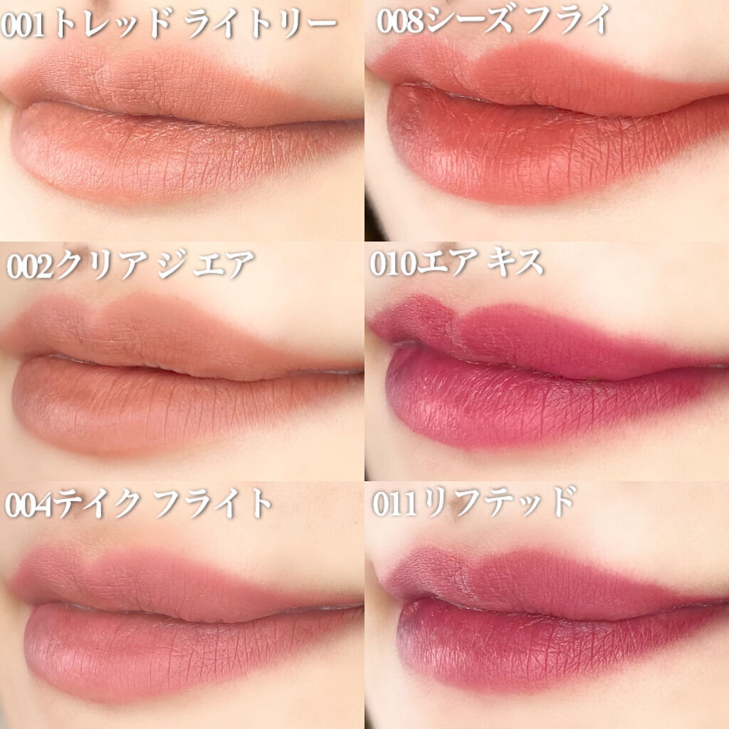 - <001 トレッド ライトリー> イソドデカン、カプリリルメチコン、合成ワックス、リンゴ酸ジイソステアリル、ポリブテン、ベヘン酸セテアリル、シリカ、マンゴー種子油、テトラ(ジ-t-ブチルヒドロキシヒドロケイヒ酸)ペンタエリスリチル、安息香酸ベンジル、香料 [+/-] マイカ、合成フルオロフロゴパイト、硫酸Ba、ロジン、酸化チタン、酸化鉄、マンガンバイオレット、赤201、赤202、黄5、青1 <002 クリア ジ エア> イソドデカン、カプリリルメチコン、合成ワックス、リンゴ酸ジイソステアリル、ポリブテン、ベヘン酸セテアリル、シリカ、マンゴー種子油、テトラ(ジ-t-ブチルヒドロキシヒドロケイヒ酸)ペンタエリスリチル、安息香酸ベンジル、香料 [+/-] マイカ、合成フルオロフロゴパイト、硫酸Ba、ロジン、酸化チタン、酸化鉄、マンガンバイオレット、赤201、赤202、黄5、青1 <003 スフレ オール デイ> イソドデカン、カプリリルメチコン、合成ワックス、リンゴ酸ジイソステアリル、ポリブテン、ベヘン酸セテアリル、シリカ、マンゴー種子油、テトラ(ジ-t-ブチルヒドロキシヒドロケイヒ酸)ペンタエリスリチル、安息香酸ベンジル、香料 [+/-] マイカ、合成フルオロフロゴパイト、硫酸Ba、ロジン、酸化チタン、酸化鉄、マンガンバイオレット、赤201、赤202、黄5、青1 <008 シーズ フライ> イソドデカン、カプリリルメチコン、合成ワックス、リンゴ酸ジイソステアリル、ポリブテン、ベヘン酸セテアリル、シリカ、マンゴー種子油、テトラ(ジ-t-ブチルヒドロキシヒドロケイヒ酸)ペンタエリスリチル、安息香酸ベンジル、香料 [+/-] マイカ、合成フルオロフロゴパイト、硫酸Ba、ロジン、酸化チタン、酸化鉄、マンガンバイオレット、赤201、赤202、黄5、青1 <010 エア キス> イソドデカン、カプリリルメチコン、合成ワックス、リンゴ酸ジイソステアリル、ポリブテン、ベヘン酸セテアリル、シリカ、マンゴー種子油、テトラ(ジ-t-ブチルヒドロキシヒドロケイヒ酸)ペンタエリスリチル、安息香酸ベンジル、香料 [+/-] マイカ、合成フルオロフロゴパイト、硫酸Ba、ロジン、酸化チタン、酸化鉄、マンガンバイオレット、赤201、赤202、黄5、青1 <011 リフテッド> イソドデカン、カプリリルメチコン、合成ワックス、リンゴ酸ジイソステアリル、ポリブテン、ベヘン酸セテアリル、シリカ、マンゴー種子油、テトラ(ジ-t-ブチルヒドロキシヒドロケイヒ酸)ペンタエリスリチル、安息香酸ベンジル、香料 [+/-] マイカ、合成フルオロフロゴパイト、硫酸Ba、ロジン、酸化チタン、酸化鉄、マンガンバイオレット、赤201、赤202、黄5、青1 <004 テイク フライト> イソドデカン、カプリリルメチコン、合成ワックス、リンゴ酸ジイソステアリル、ポリブテン、ベヘン酸セテアリル、シリカ、マンゴー種子油、テトラ(ジ-t-ブチルヒドロキシヒドロケイヒ酸)ペンタエリスリチル、安息香酸ベンジル、香料 [+/-] マイカ、合成フルオロフロゴパイト、硫酸Ba、ロジン、酸化チタン、酸化鉄、マンガンバイオレット、赤201、赤202、黄5、青1