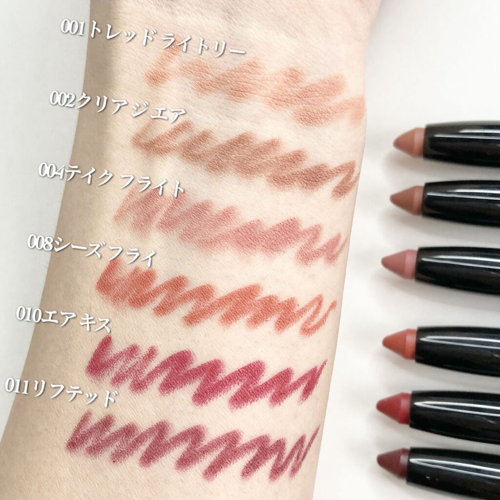 薄づきの発色だからリップクリーム感覚で塗れる! 色持ちはそこまで良くなかったです😥 唇の輪郭やボリュームが欲しいところをなぞるのがおすすめ✨ カラー紹介♡ 001シェル ピンク002ブラックカラント 003アメリカン チェリー 004フロスト ローズ 005フィグ タルト 006ヌード ピンク 007プラム ワイン 008アップル パンチ 009ボンボン ショコラ