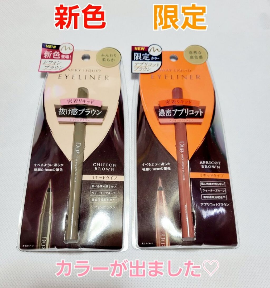 - 筆先までずっとなめらか、目尻で感動するリキッドアイライナー。 必要な量が肌にのる新設計で、まぶたの上をすべるような、滑らかな描き心地。しなやかでコシのある筆が、筆圧のコントロールを容易にし、太いラインも細いラインも思い通りに仕上げます。水、汗、涙に強いウォータープルーフタイプなのに、通常洗顔で簡単オフ。肌に色素が残らない顔料を使用。5種類の美容液成分を従来品の200%配合し、メイクしながら目元ケアまで。 ●ブラウンブラック ※2020年9月12日 バラエティショップ先行発売 ●漆黒ブラック ※2020年12月頃発売予定 ●ナチュラルブラウン ※2020年12月頃発売予定 ●シフォンブラウン 「毎日メイクに透明感と抜け感」 ブラウンでも、グレーでも、ベージュでもないニュアンスカラー。 自然な印影で素の目元を際立て、頑張りすぎない、ふんわりとした目元に。 ●アプリコットブラウン 「じゅわっと血色感。 肌に馴染むおしゃれカラー」 温かみのあるアプリコットがじゅわっと滲む血色感を目元に演出。 肌馴染みが良いので、カラーライナーに抵抗がある方もブラウンの延長線上で楽しめる、使いやすい色味です。 ”ちょっとオシャレ”な空気感を演出するカラー。 ●ピンクショコラ アイライナー 「ピンクが溶け込む濃厚ブラウン」 肌馴染みが良く、目元にじんわり血色感をプラス。 さりげなく女性らしさが加速するようなカラー。 ●ピスタチオラテ (2022年7月29日(金)発売) 「“目尻”に抜け感アクセント」 肌に馴染むのに映える絶妙なグリーン。 トレンドカラーに“くすみ”と“抜け感”をプラスしたまろやかな発色。 ●マスタードブラウン 「“イエロー”が揺れる、大人の洒落色」 (2022年7月29日(金)発売) まるで太陽のような暖かさを感じる新しいブラウン。 ほんのり感じるイエローでメイクが一気に垢抜ける稀有な色。 ●シフォンピンク(2023年2月10日発売) 「ふんわり柔らか"まろみピンク"」 甘くなりすぎない青みニュアンスで目元の透明感UP。 目元を引き締め、ピンクメイクにありがちな腫れぼったさを解消。 ●ミルクカプチーノ(2023年4月21日発売) まろやかな深みの“優しい締め色” どんなメイクにも合わせやすいカラー。 自然な陰影でさりげなく目幅を拡張します。 ●グレーカシミア(2023年10月1日発売) ブラウンがほんのり溶け込んだ、暖色グレー まろやかな発色で、パーソナルカラーを問わず肌に馴染む 目元の陰影になりすまし、抜け感と目力を欲張りに叶える ●ダークフィグ(2024年6月1日発売) するする”なめらか。描きやすいのに、落ちにくい。 クッキリ可愛いほの甘ダークブラウン ●ピーチモカ(2024年8月1日発売) ふわっと自然に盛れる“桃色ブラウン” ほんのり血色感で目元にうるみ感を演出 ●スターダストブラウン(2024年12月11日発売) キラッと繊細に輝く''星屑ブラウン'' 透け感のあるダークブラウンの色味とラメの輝きが、目元に艶のある立体感を演出 ●チャコールモカ(2025年4月10日発売) 目元を締める''深みグレージュ'' 黄みや赤みに偏りすぎない絶妙な色設計で、自然に目元を強調