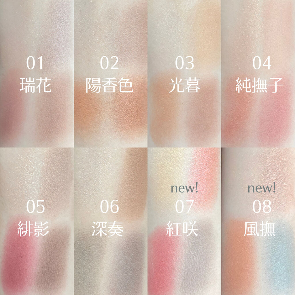 - <01 瑞花 -MIZUHANA> マイカ、合成フルオロフロゴパイト、タルク、ジメチコン、ジフェニルシロキシフェニルトリメチコン、ラウロイルグルタミン酸ジ(フィトステリル/オクチルドデシル)、シリカ、(ジメチコン/ビニルジメチコン)クロスポリマー、ジステアリン酸Al、ミリスチン酸Mg、リンゴ酸ジイソステアリル、ミリスチン酸亜鉛、ステアロイルグルタミン酸2Na、イソステアリン酸ソルビタン、メチコン、水酸化Al、ホホバ種子油、シア脂、カニナバラ果実油、ラウロイルグルタミン酸ジ(オクチルドデシル/フィトステリル/ベヘニル)、ヒアルロン酸Na、クロルフェネシン、デヒドロ酢酸Na、(+/-)アルミナ、グンジョウ、コンジョウ、酸化チタン、酸化鉄、酸化スズ、ホウケイ酸(Ca/Al)、黄4、赤202、赤226 <02 陽香色 -YOUKOUIRO> マイカ、合成フルオロフロゴパイト、タルク、ジメチコン、ジフェニルシロキシフェニルトリメチコン、ラウロイルグルタミン酸ジ(フィトステリル/オクチルドデシル)、シリカ、(ジメチコン/ビニルジメチコン)クロスポリマー、ジステアリン酸Al、ミリスチン酸Mg、リンゴ酸ジイソステアリル、ミリスチン酸亜鉛、ステアロイルグルタミン酸2Na、イソステアリン酸ソルビタン、メチコン、水酸化Al、ホホバ種子油、シア脂、カニナバラ果実油、ラウロイルグルタミン酸ジ(オクチルドデシル/フィトステリル/ベヘニル)、ヒアルロン酸Na、クロルフェネシン、デヒドロ酢酸Na、(+/-)アルミナ、グンジョウ、コンジョウ、酸化チタン、酸化鉄、酸化スズ、ホウケイ酸(Ca/Al)、黄4、赤202、赤226 <03 光暮 -HIKARIGURE> マイカ、タルク、合成フルオロフロゴパイト、ジメチコン、ジフェニルシロキシフェニルトリメチコン、ラウロイルグルタミン酸ジ(フィトステリル/オクチルドデシル)、シリカ、(ジメチコン/ビニルジメチコン)クロスポリマー、ジステアリン酸Al、ミリスチン酸Mg、リンゴ酸ジイソステアリル、ミリスチン酸亜鉛、ステアロイルグルタミン酸2Na、イソステアリン酸ソルビタン、水酸化Al、ホホバ種子油、シア脂、カニナバラ果実油、ラウロイルグルタミン酸ジ(オクチルドデシル/フィトステリル/ベヘニル)、ヒアルロン酸Na、クロルフェネシン、デヒドロ酢酸Na、(+/-)アルミナ、酸化チタン、酸化鉄、酸化スズ、ホウケイ酸(Ca/Al)、赤226 <04 純撫子 - SUMINADESHIKO> マイカ、合成フルオロフロゴパイト、タルク、ジメチコン、ジフェニルシロキシフェニルトリメチコン、ラウロイルグルタミン酸ジ(フィトステリル/オクチルドデシル)、シリカ、(ジメチコン/ビニルジメチコン)クロスポリマー、ジステアリン酸Al、ミリスチン酸Mg、リンゴ酸ジイソステアリル、ミリスチン酸亜鉛、ステアロイルグルタミン酸2Na、イソステアリン酸ソルビタン、メチコン、水酸化Al、ホホバ種子油、シア脂、カニナバラ果実油、ラウロイルグルタミン酸ジ(オクチルドデシル/フィトステリル/ベヘニル)、ヒアルロン酸Na、クロルフェネシン、デヒドロ酢酸Na、(+/-)アルミナ、グンジョウ、コンジョウ、酸化チタン、酸化鉄、酸化スズ、ホウケイ酸(Ca/Al)、黄4、赤202、赤226 <05 緋影 - AKEKAGE> マイカ、合成フルオロフロゴパイト、タルク、ジメチコン、ジフェニルシロキシフェニルトリメチコン、ラウロイルグルタミン酸ジ(フィトステリル/オクチルドデシル)、シリカ、(ジメチコン/ビニルジメチコン)クロスポリマー、ジステアリン酸Al、ミリスチン酸Mg、リンゴ酸ジイソステアリル、ミリスチン酸亜鉛、ステアロイルグルタミン酸2Na、イソステアリン酸ソルビタン、メチコン、水酸化Al、ホホバ種子油、シア脂、カニナバラ果実油、ラウロイルグルタミン酸ジ(オクチルドデシル/フィトステリル/ベヘニル)、ヒアルロン酸Na、クロルフェネシン、デヒドロ酢酸Na、(+/-)アルミナ、グンジョウ、コンジョウ、酸化チタン、酸化鉄、酸化スズ、ホウケイ酸(Ca/Al)、黄4、赤202、赤226 <06 深奏 - FUKAKANADE> マイカ、合成フルオロフロゴパイト、タルク、ジメチコン、ジフェニルシロキシフェニルトリメチコン、ラウロイルグルタミン酸ジ(フィトステリル/オクチルドデシル)、シリカ、(ジメチコン/ビニルジメチコン)クロスポリマー、ジステアリン酸Al、ミリスチン酸Mg、リンゴ酸ジイソステアリル、ミリスチン酸亜鉛、ステアロイルグルタミン酸2Na、イソステアリン酸ソルビタン、メチコン、水酸化Al、ホホバ種子油、シア脂、カニナバラ果実油、ラウロイルグルタミン酸ジ(オクチルドデシル/フィトステリル/ベヘニル)、ヒアルロン酸Na、クロルフェネシン、デヒドロ酢酸Na、(+/-)アルミナ、グンジョウ、コンジョウ、酸化チタン、酸化鉄、酸化スズ、ホウケイ酸(Ca/Al)、黄4、赤202、赤226 <08 風撫 -KAZENADE-> マイカ、タルク、合成フルオロフロゴパイト、ジフェニルシロキシフェニルトリメチコン、ジメチコン、ワセリン、ラウロイルグルタミン酸ジ(フィトステリル/オクチルドデシル)、シリカ、リンゴ酸ジイソステアリル、ステアロイルグルタミン酸2Na、ミリスチン酸亜鉛、トリイソステアリン酸イ