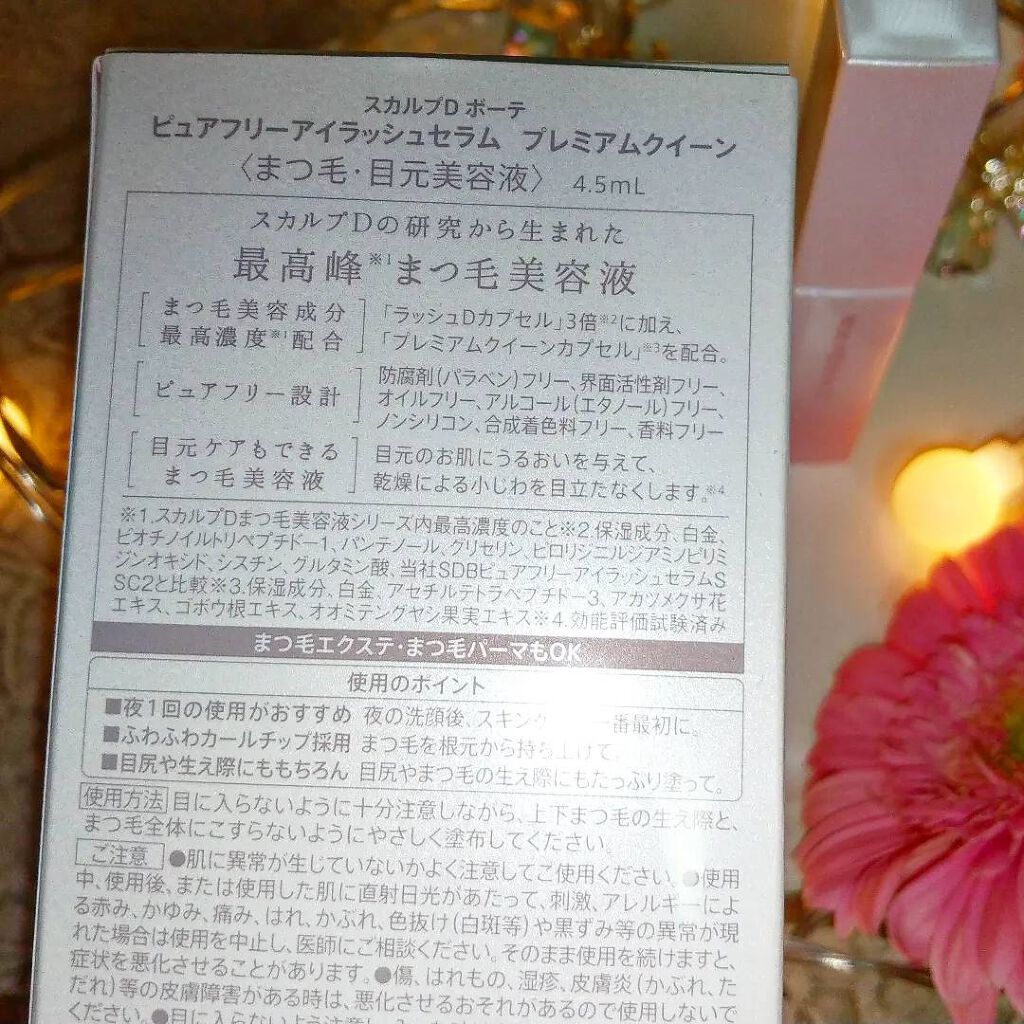 - スカルプDまつ毛美容液シリーズ史上まつ毛美容成分最高濃度※1♪ 「ラッシュDカプセル」3倍※2に加え、独自開発の「プレミアムクイーンカプセル」※3 を配合。 さらに「目元ケアもできるまつ毛美容液」として目元のお肌にうるおいを与えて、乾燥による小じわを目立たなくします※4。 使いやすさ・やさしさにこだわった、ふわふわカールチップ採用で根元からも塗りやすく、敏感な目元にやさしい使い心地。 シリコン、オイル、アルコール(エタノール)、防腐剤(パラベン)、香料、合成着色料、界面活性剤、プロスタグランジン類似物質の8つの成分不使用のピュアフリー設計を実現。まつ毛エクステ、まつ毛パーマにも使え、1日1回のケアでもOKとなっています。 ※1.スカルプDまつ毛美容液シリーズ内最高濃度のこと※2.保湿成分、白金、ビオチノイルトリペプチド-1、パンテノール、グリセリン、ピロリジニルジアミノピリミジンオキシド、シスチン、グルタミン酸、当社SDBピュアフリーアイラッシュセラムSSC2と比較※3.保湿成分、白金、アセチルテトラペプチド-3、アカツメクサ花エキス、ゴボウ根エキス、オオミテングヤシ果実エキス※4.効能評価試験済み