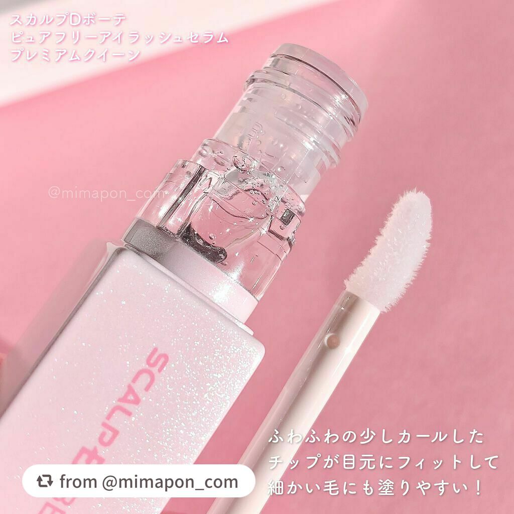 - スカルプDまつ毛美容液シリーズ史上まつ毛美容成分最高濃度※1♪ 「ラッシュDカプセル」3倍※2に加え、独自開発の「プレミアムクイーンカプセル」※3 を配合。 さらに「目元ケアもできるまつ毛美容液」として目元のお肌にうるおいを与えて、乾燥による小じわを目立たなくします※4。 使いやすさ・やさしさにこだわった、ふわふわカールチップ採用で根元からも塗りやすく、敏感な目元にやさしい使い心地。 シリコン、オイル、アルコール(エタノール)、防腐剤(パラベン)、香料、合成着色料、界面活性剤、プロスタグランジン類似物質の8つの成分不使用のピュアフリー設計を実現。まつ毛エクステ、まつ毛パーマにも使え、1日1回のケアでもOKとなっています。 ※1.スカルプDまつ毛美容液シリーズ内最高濃度のこと※2.保湿成分、白金、ビオチノイルトリペプチド-1、パンテノール、グリセリン、ピロリジニルジアミノピリミジンオキシド、シスチン、グルタミン酸、当社SDBピュアフリーアイラッシュセラムSSC2と比較※3.保湿成分、白金、アセチルテトラペプチド-3、アカツメクサ花エキス、ゴボウ根エキス、オオミテングヤシ果実エキス※4.効能評価試験済み