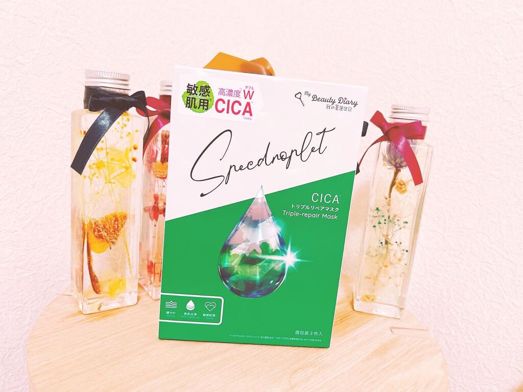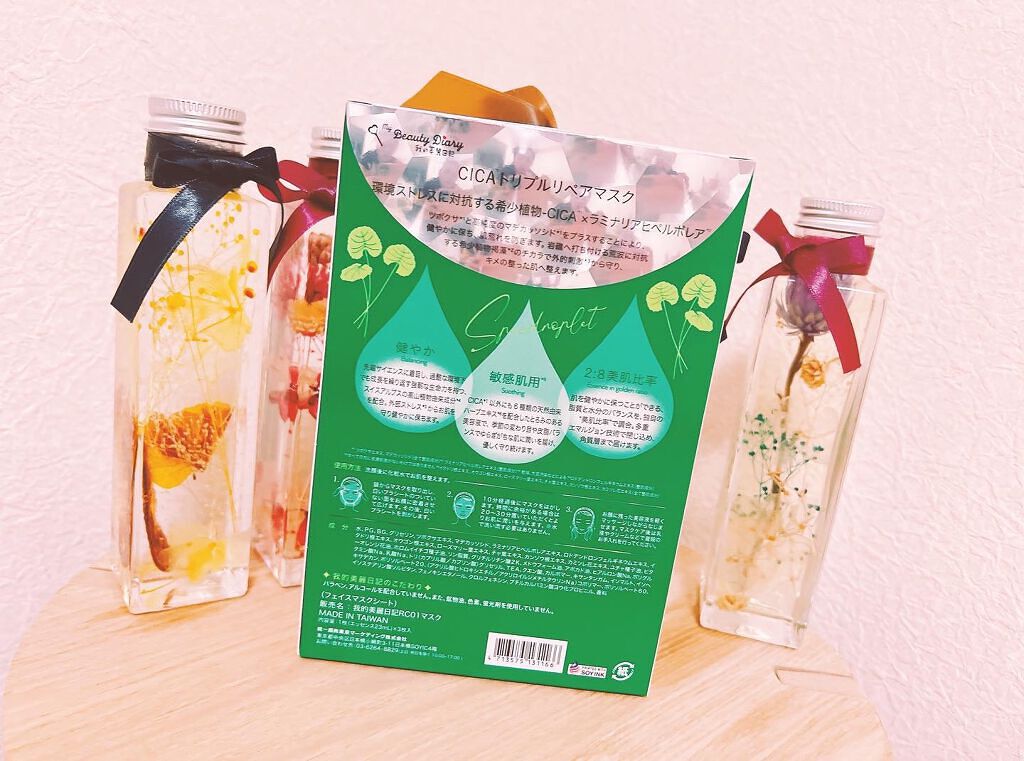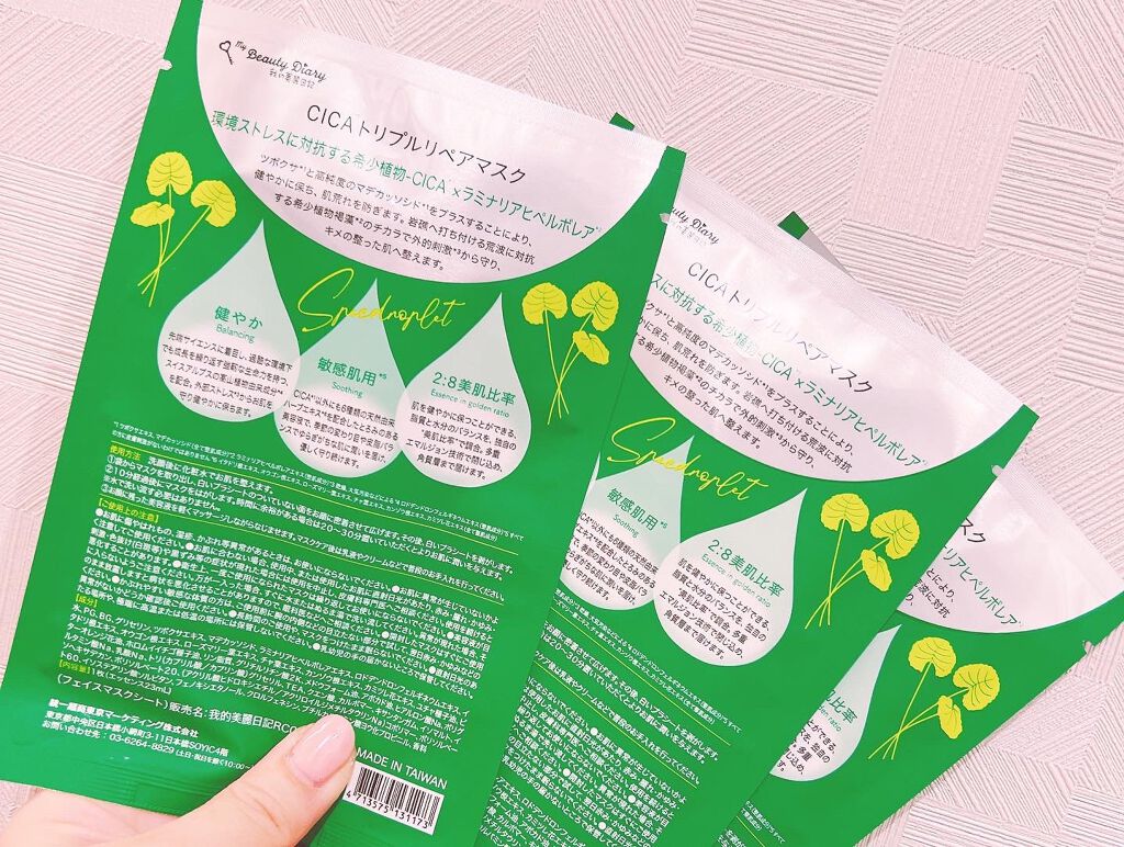 - 我的美麗日記からCICAマスク登場!! 環境ストレスに対抗する植物- CICA*1×ラミナリアヒペルボレア*2 ツボクサ*1と高純度のマデカッソシド*1をプラスし、肌荒れを防ぎます。 希少植物褐藻*2のチカラで乾燥等の外的刺激から守り、キメの整った肌へ整えます。 健やか Balancing 過酷な環境下で成長を繰り返す、スイスアルプスの高山植物由来成分*3を配合。外部ストレスからお肌を守り健やかに保ちます。 敏感肌用*4 Soothing 6 種類の天然由来ハーブエキス*5を配合した美容液で、ゆるぎがちな肌に潤いを届け、優しく守り続けます。 2:8美肌比率 Essence in golden ratio 脂質と水分のバランスを、独自の""美肌比率""で調合し、肌を健やかに保ちます。多重エマルジョン技術で閉じ込め、角質層まで届けます。 ◆我的美麗日記のこだわり◆ パラベン、アルコールを配合していません。また、鉱物油、色素、蛍光剤を使用していません。 *1ツボクサエキス、マデカッソシド(全て整肌成分)*2ラミナリアヒペルボレアエキス(整肌成分)*3ロドデンドロンフェルギネウムエキス(整肌成分)*4すべての方に皮膚刺激がないわけではありません*5イタドリ根エキス、オウゴン根エキス、ローズマリー葉エキス、チャ葉エキス、カンゾウ根エキス、カミツレ花エキス(全て整肌成分) 使い方 事前に洗顔後に化粧水でお肌を整えます。 1、袋からマスクを取り出しお顔全体に広げる。白いプラシートははがす。 2、10分経過後にマスクをはがす。時間に余裕がある場合は20~30分置いていただくとよりお肌に潤いを与えます。 3、お顔に美容液が残っている時は、指先で軽くマッサージしながらなじませる。※水で洗い流す必要はありません。マスクケア後は乳液やクリームなどで普段のお手入れを行ってください。