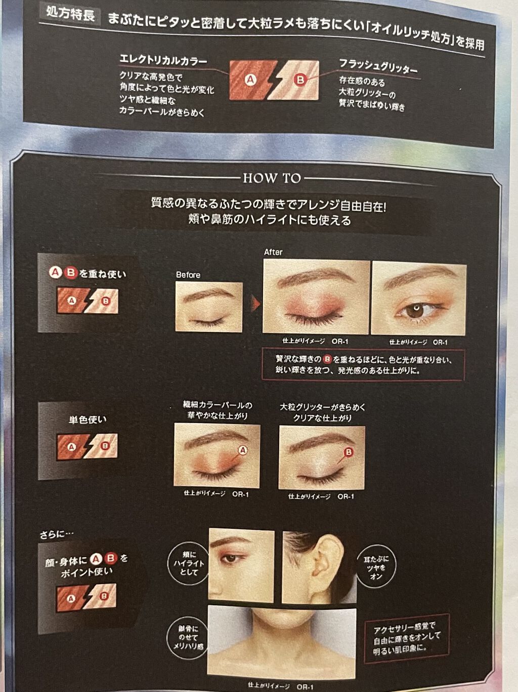 - 質感の違う2つの輝きで火花がクラッシュしたような発光感のある目元印象をつくるアイシャドウ。 まぶたにピタッと密着して、大粒ラメも落ちにくい処方設計。 繊細なカラーパールがきらめくエレクトリカルカラーと存在感のある大粒グリッターでまぶしい輝きを演出するフラッシュグリッターの2つの質感を掛け合わせて、輝き自由自在。 目元以外にも頬や鼻筋のハイライトに使える。