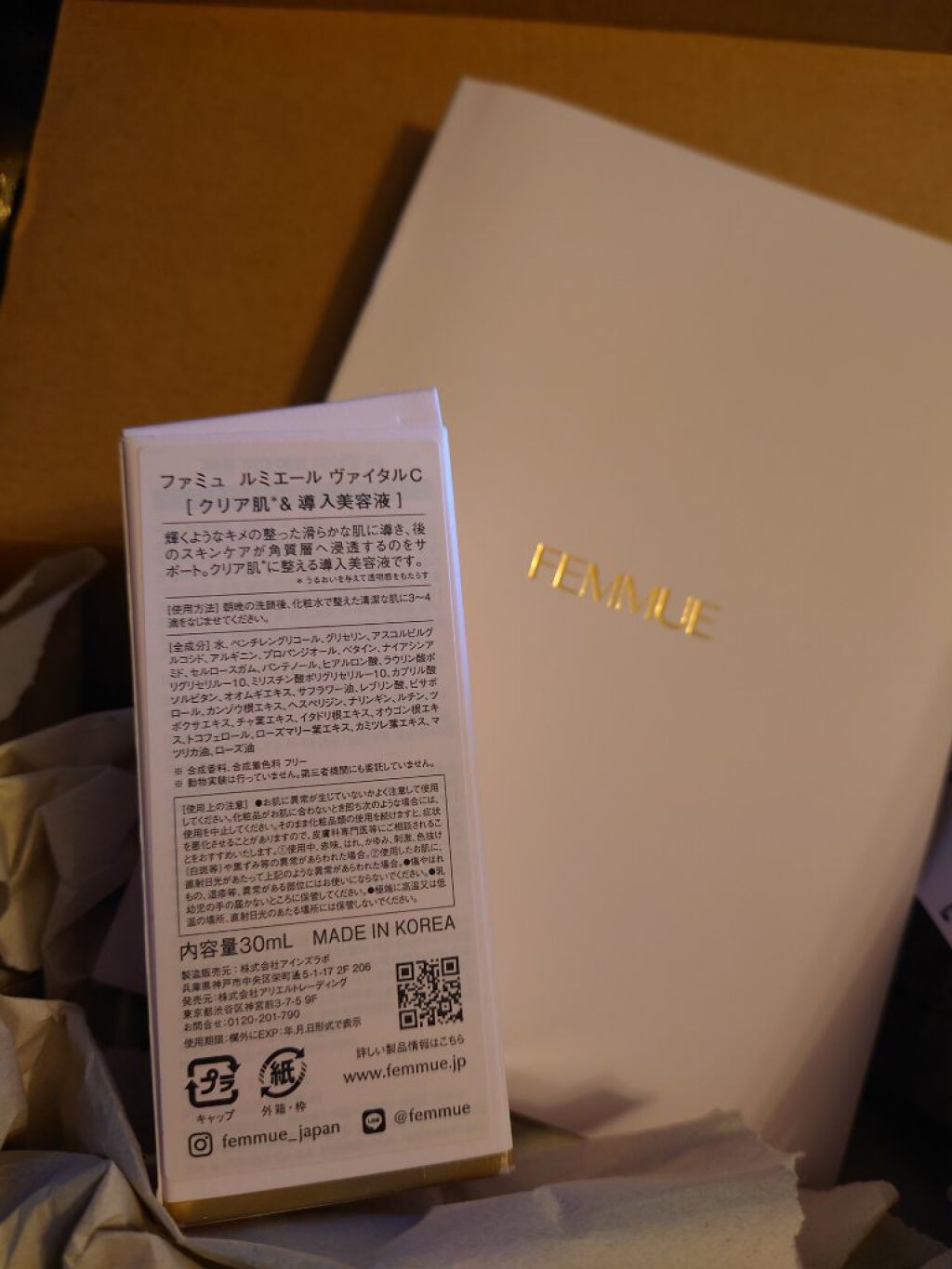 ✨✨✨✨✨✨✨✨✨✨✨✨✨✨✨✨✨✨✨✨✨FEMMUEルミエールヴァイタルCクリア肌&美容導入液30ml香りはほのかに香るサラサラしたテクスチャー今までなかなか高い美容液って使ってこなかったですけど…使い心地も良く浸透して、使用して4日ほど…...