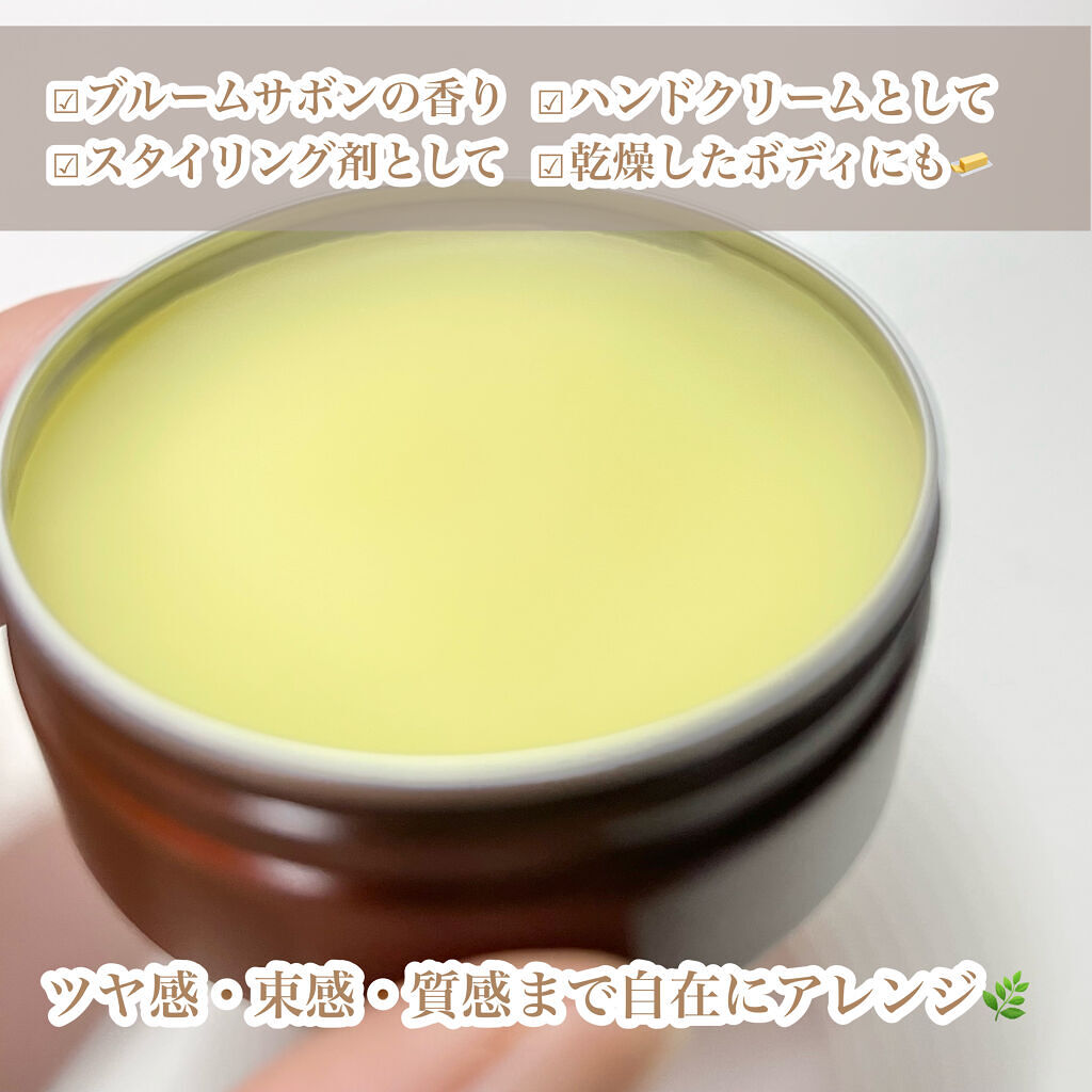 - 「ツヤ感・束感・質感」まで自在にアレンジする、マルチバームワックス。オーガニックシアバター*配合。べたつきにくくなじみやすい柔らかなテクスチャーで、パサついた髪も補修しながら自然な動きを演出します。99%天然由来成分でできているため、スタイリングワックスとしてだけではなく、ハンドクリームやボディクリームとしてもマルチにご使用いただけます。ブルームサボンの香り。* シア脂(保湿)