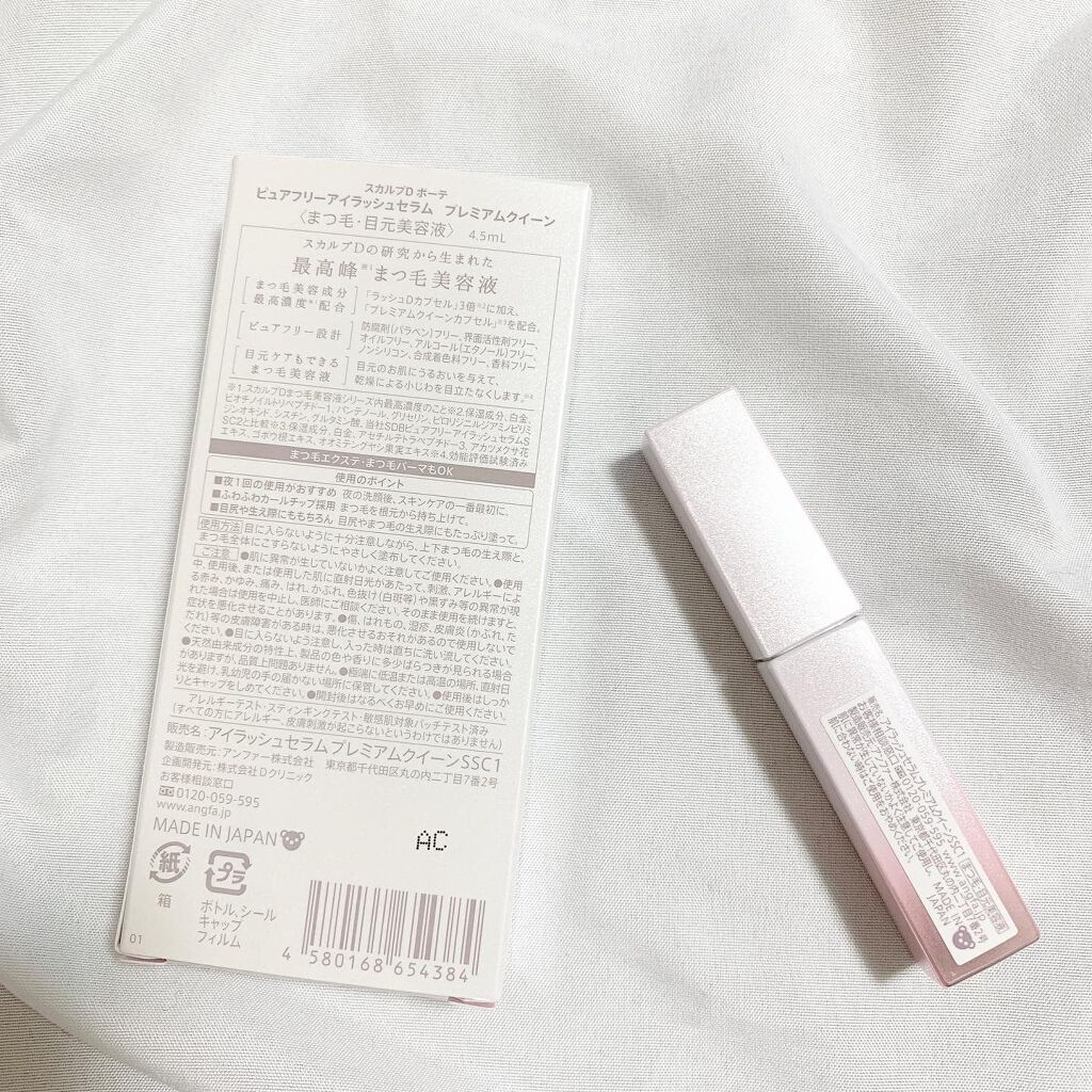 - スカルプDまつ毛美容液シリーズ史上まつ毛美容成分最高濃度※1♪ 「ラッシュDカプセル」3倍※2に加え、独自開発の「プレミアムクイーンカプセル」※3 を配合。 さらに「目元ケアもできるまつ毛美容液」として目元のお肌にうるおいを与えて、乾燥による小じわを目立たなくします※4。 使いやすさ・やさしさにこだわった、ふわふわカールチップ採用で根元からも塗りやすく、敏感な目元にやさしい使い心地。 シリコン、オイル、アルコール(エタノール)、防腐剤(パラベン)、香料、合成着色料、界面活性剤、プロスタグランジン類似物質の8つの成分不使用のピュアフリー設計を実現。まつ毛エクステ、まつ毛パーマにも使え、1日1回のケアでもOKとなっています。 ※1.スカルプDまつ毛美容液シリーズ内最高濃度のこと※2.保湿成分、白金、ビオチノイルトリペプチド-1、パンテノール、グリセリン、ピロリジニルジアミノピリミジンオキシド、シスチン、グルタミン酸、当社SDBピュアフリーアイラッシュセラムSSC2と比較※3.保湿成分、白金、アセチルテトラペプチド-3、アカツメクサ花エキス、ゴボウ根エキス、オオミテングヤシ果実エキス※4.効能評価試験済み