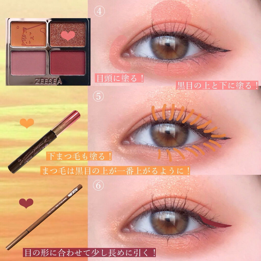 \にゃんこアイシャドウメイク/💐ZEESEAアニマルアイシャドウ05都会の夕暮れパキッとした発色が有名なZEESEAオレンジのアイシャドウでまるで夕焼け気分夏なので明るさと発色重視で濃い締め色は使わずメイクしたよラメがざくざくなのに...