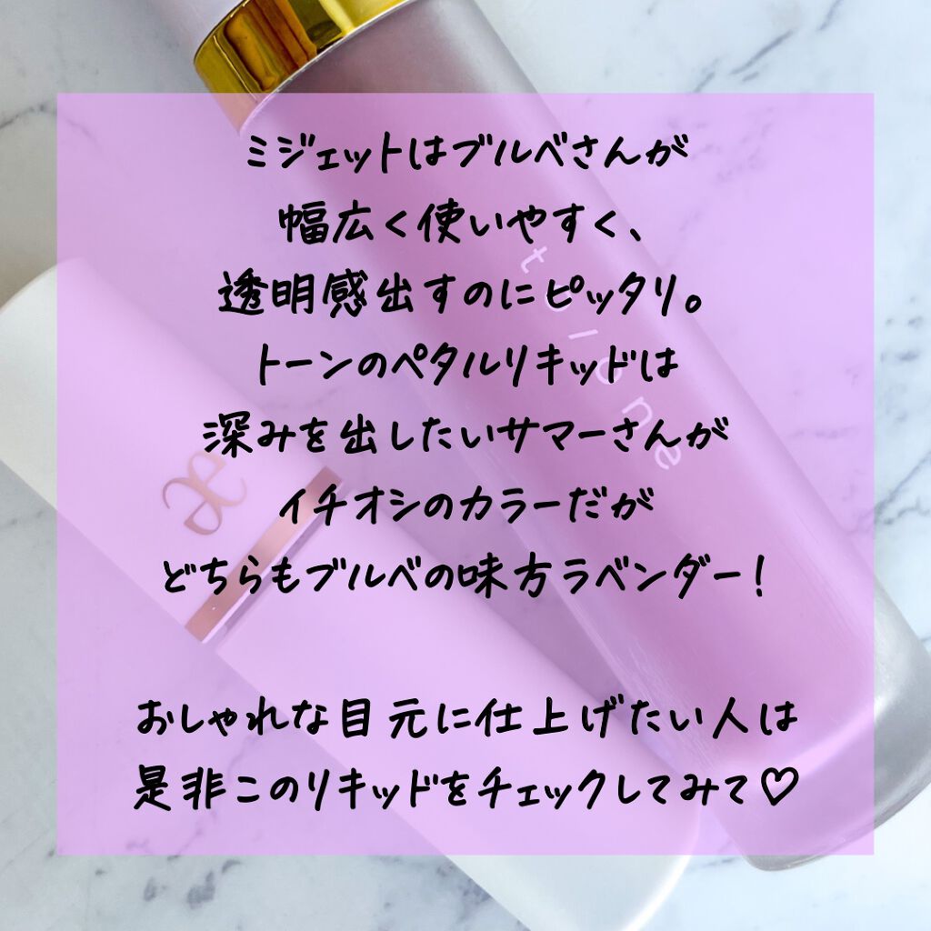 | リキッドアイシャドウランキング第9位 | 塗る時のコツは手早く伸ばすこと。塗り広げるとじゅわっと滲み出るような発色でかわいいです。 | 詳細を見る | |