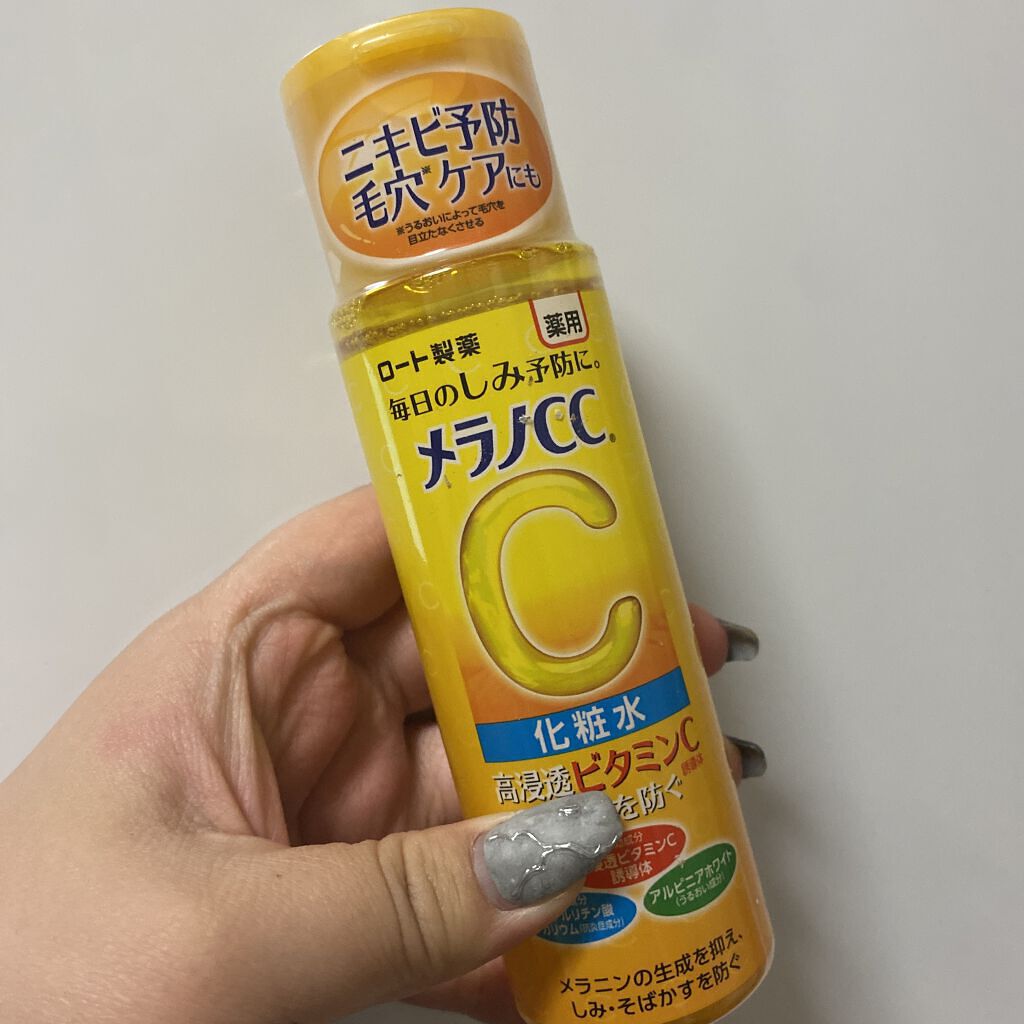 - 「メラノCC 薬用しみ対策 美白化粧水」は、顔全体にうるおいを与えながら、しみ対策できる薬用美白化粧水。 美白有効成分高浸透ビタミンC誘導体*1が角質層すみずみまで浸透し、メラニンの生成を抑え、しみ・そばかすを防ぎ、透明感のある肌へと導きます。 また、抗炎症成分*2と3種のうるおい成分*3を配合。ニキビ痕が気になる肌にもうるおいを与え、肌を整えます。 さわやかな柑橘系の香りです。 *1:3-O-エチルアスコルビン酸 *2:グリチルリチン酸ジカリウム *3:アルピニアホワイト、レモンエキス、グレープフルーツエキス
