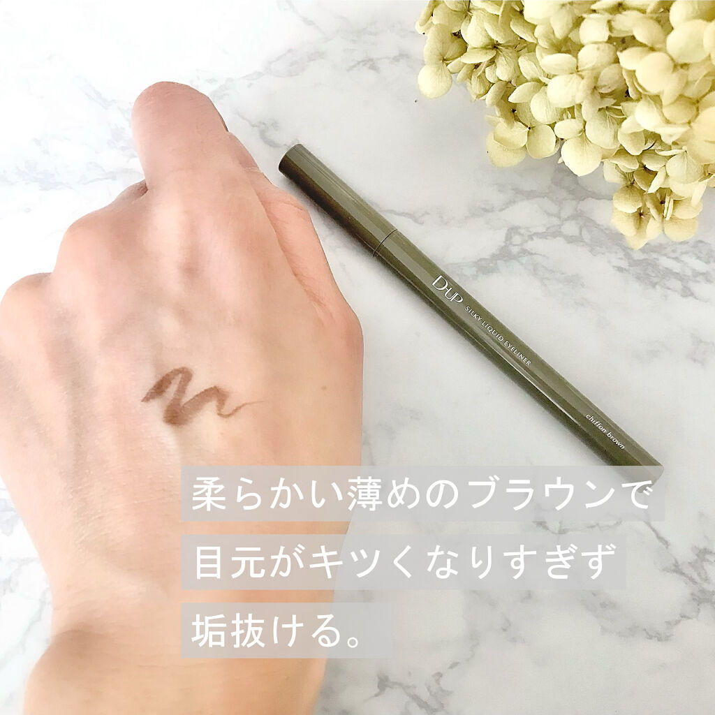 - 筆先までずっとなめらか、目尻で感動するリキッドアイライナー。 必要な量が肌にのる新設計で、まぶたの上をすべるような、滑らかな描き心地。しなやかでコシのある筆が、筆圧のコントロールを容易にし、太いラインも細いラインも思い通りに仕上げます。水、汗、涙に強いウォータープルーフタイプなのに、通常洗顔で簡単オフ。肌に色素が残らない顔料を使用。5種類の美容液成分を従来品の200%配合し、メイクしながら目元ケアまで。 ●ブラウンブラック ※2020年9月12日 バラエティショップ先行発売 ●漆黒ブラック ※2020年12月頃発売予定 ●ナチュラルブラウン ※2020年12月頃発売予定 ●シフォンブラウン 「毎日メイクに透明感と抜け感」 ブラウンでも、グレーでも、ベージュでもないニュアンスカラー。 自然な印影で素の目元を際立て、頑張りすぎない、ふんわりとした目元に。 ●アプリコットブラウン 「じゅわっと血色感。 肌に馴染むおしゃれカラー」 温かみのあるアプリコットがじゅわっと滲む血色感を目元に演出。 肌馴染みが良いので、カラーライナーに抵抗がある方もブラウンの延長線上で楽しめる、使いやすい色味です。 ”ちょっとオシャレ”な空気感を演出するカラー。 ●ピンクショコラ アイライナー 「ピンクが溶け込む濃厚ブラウン」 肌馴染みが良く、目元にじんわり血色感をプラス。 さりげなく女性らしさが加速するようなカラー。 ●ピスタチオラテ (2022年7月29日(金)発売) 「“目尻”に抜け感アクセント」 肌に馴染むのに映える絶妙なグリーン。 トレンドカラーに“くすみ”と“抜け感”をプラスしたまろやかな発色。 ●マスタードブラウン 「“イエロー”が揺れる、大人の洒落色」 (2022年7月29日(金)発売) まるで太陽のような暖かさを感じる新しいブラウン。 ほんのり感じるイエローでメイクが一気に垢抜ける稀有な色。 ●シフォンピンク(2023年2月10日発売) 「ふんわり柔らか"まろみピンク"」 甘くなりすぎない青みニュアンスで目元の透明感UP。 目元を引き締め、ピンクメイクにありがちな腫れぼったさを解消。 ●ミルクカプチーノ(2023年4月21日発売) まろやかな深みの“優しい締め色” どんなメイクにも合わせやすいカラー。 自然な陰影でさりげなく目幅を拡張します。 ●グレーカシミア(2023年10月1日発売) ブラウンがほんのり溶け込んだ、暖色グレー まろやかな発色で、パーソナルカラーを問わず肌に馴染む 目元の陰影になりすまし、抜け感と目力を欲張りに叶える ●ダークフィグ(2024年6月1日発売) するする”なめらか。描きやすいのに、落ちにくい。 クッキリ可愛いほの甘ダークブラウン ●ピーチモカ(2024年8月1日発売) ふわっと自然に盛れる“桃色ブラウン” ほんのり血色感で目元にうるみ感を演出 ●スターダストブラウン(2024年12月11日発売) キラッと繊細に輝く''星屑ブラウン'' 透け感のあるダークブラウンの色味とラメの輝きが、目元に艶のある立体感を演出 ●チャコールモカ(2025年4月10日発売) 目元を締める''深みグレージュ'' 黄みや赤みに偏りすぎない絶妙な色設計で、自然に目元を強調