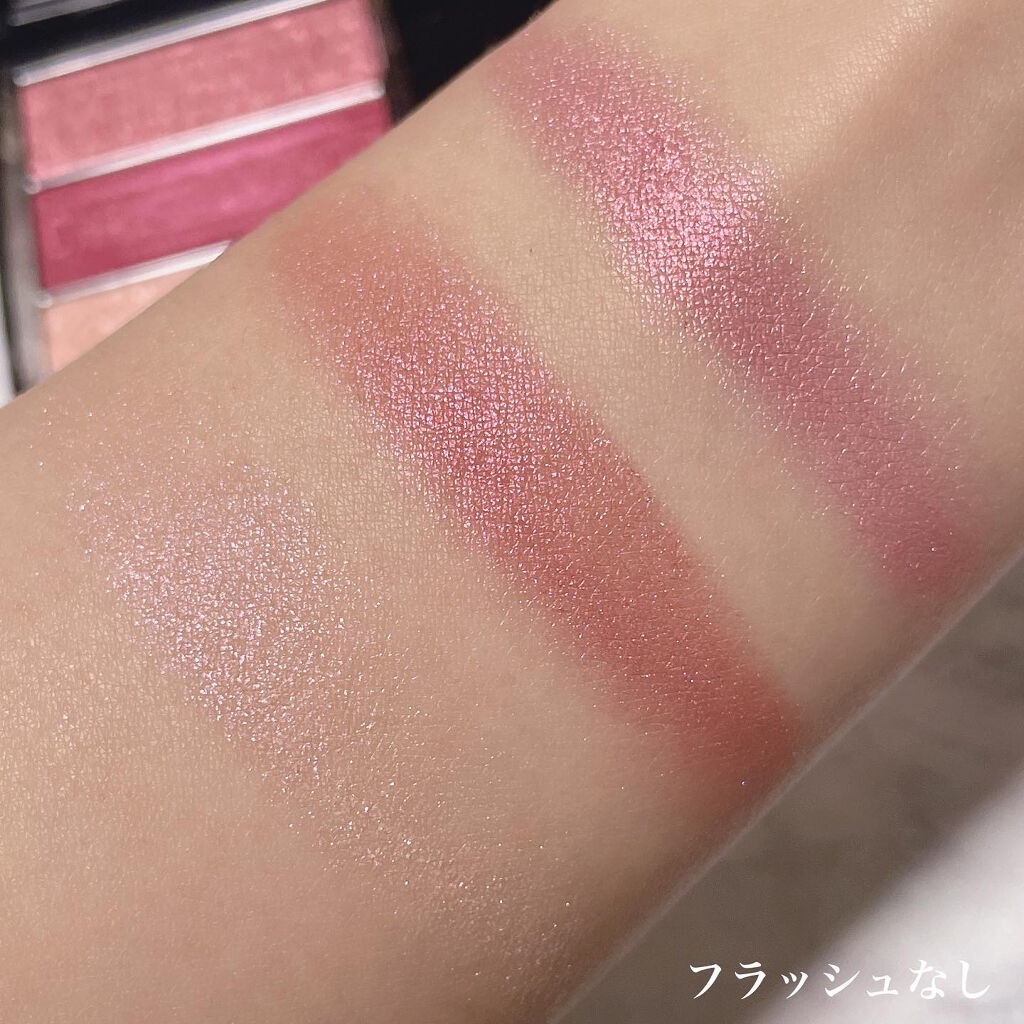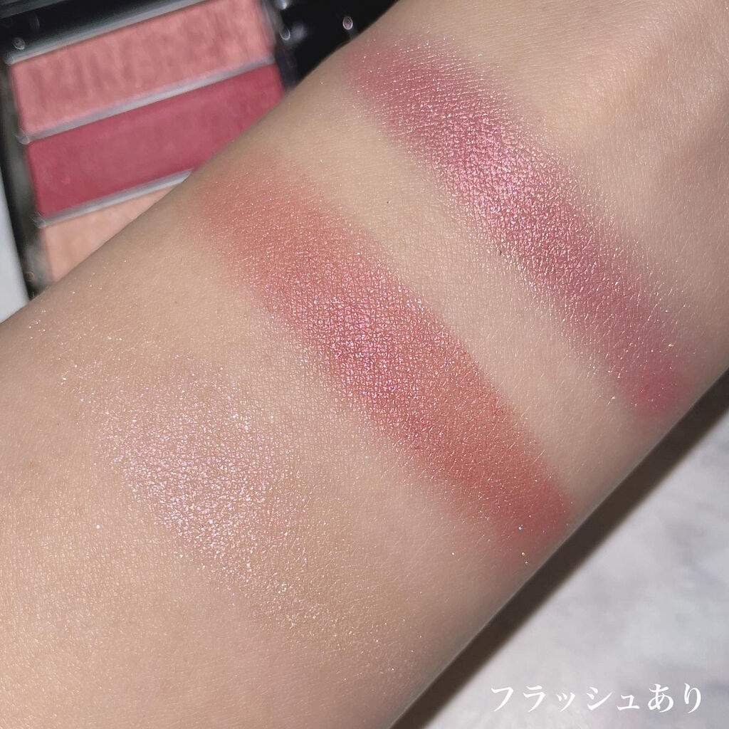 春らしい華やかさが特徴的な今季の限定パレット。ピンクを基調とした5色の絶妙なカラーがセットされたパレットでミントブルーのカラーが一際目を惹きます🥰 特に中央のメタリックピンクは、ひと塗りで目元にキラッと華やかになります🫶 軽やかでしっとりとしたテクスチャーなので粉飛びせは気になりませんでした。 使い方次第で、キュートな雰囲気のメイクからエレガントな雰囲気のメイクまでこのパレットひとつで楽しめます☺️