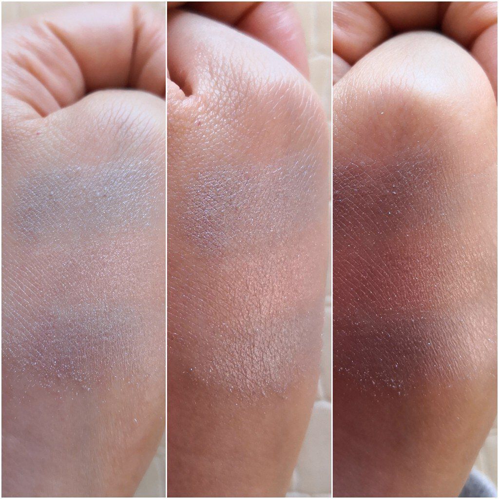 ソーダが黄味があって、ラメがオレンジ キャンディーが鮮やかでラメが白ピンク キャンディーが好き 粉質はデパコスのしっとり感はないよ。でも下地つければ粉落ちもなく発色がいい。ラメの密着もいい