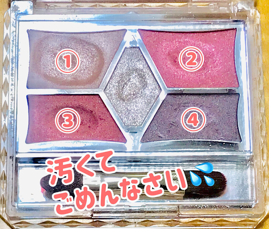 発色・・・薄めで、ブラシで取るより指で塗った方が濃く出る。 テクスチャ・・・粉っぽくサラサラ。 タイプ・・・全てのシャドウにラメが入っているのでキラキラしやすく、可愛い半面マットより扱いづらい。 実際塗ってみると、案外黄色い肌にも馴染んでくれました!ラメが多いため、顔中キラキラになりかけるので注意。 チップがついていますが、市販のものを購入して塗った方がもっと綺麗に発色しそうです。 人によって合う合わないあると思うので、ぜひ一度ツイステ民に試して欲しいパレットです(๑ơ ơ)♥️