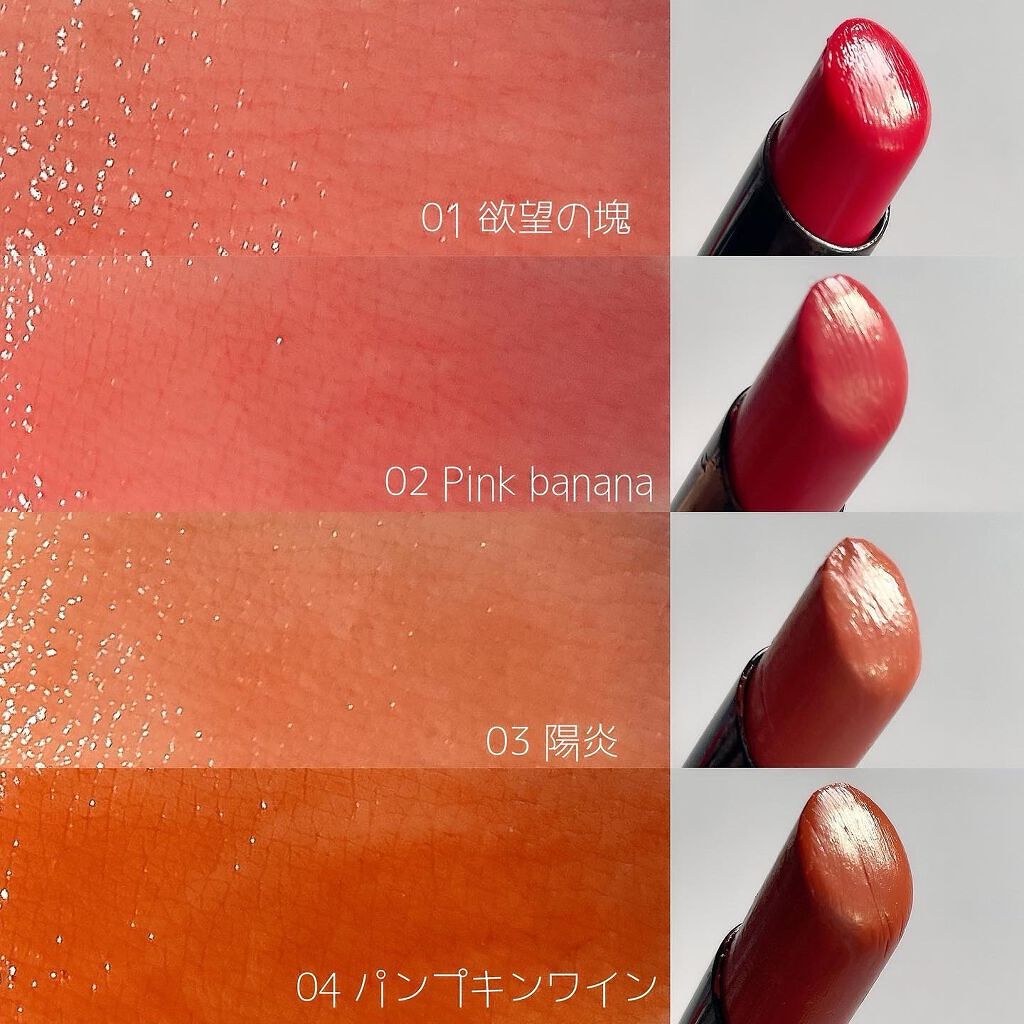 - <01 欲望の塊> テトライソステアリン酸ジペンタエリスリチル、トリ(カプリル酸/カプリン酸)グリセリル、オクチルドデカノール、ラウロイルグルタミン酸ジ(フィトステリル/オクチルドデシル)、ビスアルキル(C16-18)グリセリルウンデシルジメチコン、イソノナン酸イソトリデシル、水添ポリイソブテン、ラウロイルグルタミン酸ジ(オクチルドデシル/フィトステリル/ベヘニル)、パラフィン、合成ワックス、ダイマージリノール酸(フィトステリル/イソステアリル/セチル/ステアリル/ベヘニル)、マイクロクリスタリンワックス、水添マイクロクリスタリンワックス、ヒドロキシステアリン酸エチルヘキシル、トコフェロール、ホホバ種子油、オリーブ果実油、アーモンド油、(エチレン/プロピレン)コポリマー、ポリエチレン、ジメチコン、(+/-)(チタン/酸化チタン)焼結物、マイカ、ラウロイルアスパラギン酸Na、ラウロイルリシン、塩化亜鉛、酸化チタン、酸化鉄、水酸化Al、硫酸Ba、トリイソステアリン酸イソプロピルチタン、酸化スズ、ホウケイ酸(Ca/Al)、合成フルオロフロゴパイト、黄4、黄5、赤104(1)、赤201、赤202 <02 ピンクバナナ> テトライソステアリン酸ジペンタエリスリチル、トリ(カプリル酸/カプリン酸)グリセリル、オクチルドデカノール、ラウロイルグルタミン酸ジ(フィトステリル/オクチルドデシル)、ビスアルキル(C16-18)グリセリルウンデシルジメチコン、イソノナン酸イソトリデシル、水添ポリイソブテン、ラウロイルグルタミン酸ジ(オクチルドデシル/フィトステリル/ベヘニル)、パラフィン、合成ワックス、ダイマージリノール酸(フィトステリル/イソステアリル/セチル/ステアリル/ベヘニル)、マイクロクリスタリンワックス、水添マイクロクリスタリンワックス、ヒドロキシステアリン酸エチルヘキシル、トコフェロール、ホホバ種子油、オリーブ果実油、アーモンド油、(エチレン/プロピレン)コポリマー、ポリエチレン、ジメチコン、(+/-)(チタン/酸化チタン)焼結物、マイカ、ラウロイルアスパラギン酸Na、ラウロイルリシン、塩化亜鉛、酸化チタン、酸化鉄、水酸化Al、硫酸Ba、トリイソステアリン酸イソプロピルチタン、酸化スズ、ホウケイ酸(Ca/Al)、合成フルオロフロゴパイト、黄4、黄5、赤104(1)、赤201、赤202 <03 陽炎> テトライソステアリン酸ジペンタエリスリチル、トリ(カプリル酸/カプリン酸)グリセリル、オクチルドデカノール、ラウロイルグルタミン酸ジ(フィトステリル/オクチルドデシル)、ビスアルキル(C16-18)グリセリルウンデシルジメチコン、イソノナン酸イソトリデシル、水添ポリイソブテン、ラウロイルグルタミン酸ジ(オクチルドデシル/フィトステリル/ベヘニル)、パラフィン、合成ワックス、ダイマージリノール酸(フィトステリル/イソステアリル/セチル/ステアリル/ベヘニル)、マイクロクリスタリンワックス、水添マイクロクリスタリンワックス、ヒドロキシステアリン酸エチルヘキシル、トコフェロール、ホホバ種子油、オリーブ果実油、アーモンド油、(エチレン/プロピレン)コポリマー、ポリエチレン、ジメチコン、(+/-)(チタン/酸化チタン)焼結物、マイカ、ラウロイルアスパラギン酸Na、ラウロイルリシン、塩化亜鉛、酸化チタン、酸化鉄、水酸化Al、硫酸Ba、トリイソステアリン酸イソプロピルチタン、酸化スズ、ホウケイ酸(Ca/Al)、合成フルオロフロゴパイト、黄4、黄5、赤104(1)、赤201、赤202 <04 パンプキンワイン> テトライソステアリン酸ジペンタエリスリチル、トリ(カプリル酸/カプリン酸)グリセリル、オクチルドデカノール、ラウロイルグルタミン酸ジ(フィトステリル/オクチルドデシル)、ビスアルキル(C16-18)グリセリルウンデシルジメチコン、イソノナン酸イソトリデシル、水添ポリイソブテン、ラウロイルグルタミン酸ジ(オクチルドデシル/フィトステリル/ベヘニル)、パラフィン、合成ワックス、ダイマージリノール酸(フィトステリル/イソステアリル/セチル/ステアリル/ベヘニル)、マイクロクリスタリンワックス、水添マイクロクリスタリンワックス、ヒドロキシステアリン酸エチルヘキシル、トコフェロール、ホホバ種子油、オリーブ果実油、アーモンド油、(エチレン/プロピレン)コポリマー、ポリエチレン、ジメチコン、(+/-)(チタン/酸化チタン)焼結物、マイカ、ラウロイルアスパラギン酸Na、ラウロイルリシン、塩化亜鉛、酸化チタン、酸化鉄、水酸化Al、硫酸Ba、トリイソステアリン酸イソプロピルチタン、酸化スズ、ホウケイ酸(Ca/Al)、合成フルオロフロゴパイト、黄4、黄5、赤104(1)、赤201、赤202 <05 ダークフィグ> テトライソステアリン酸ジペンタエリスリチル、トリ(カプリル酸/カプリン酸)グリセリル、オクチルドデカノール、ラウロイルグルタミン酸ジ(フィトステリル/オクチルドデシル)、ビスアルキル(C16-18)グリセリルウンデシルジメチコン、イソノナン酸イソトリデシル、水添ポリイソブテン、ラウロイルグルタミン酸ジ(オクチルドデシル/フィトステリル/ベヘニル)、