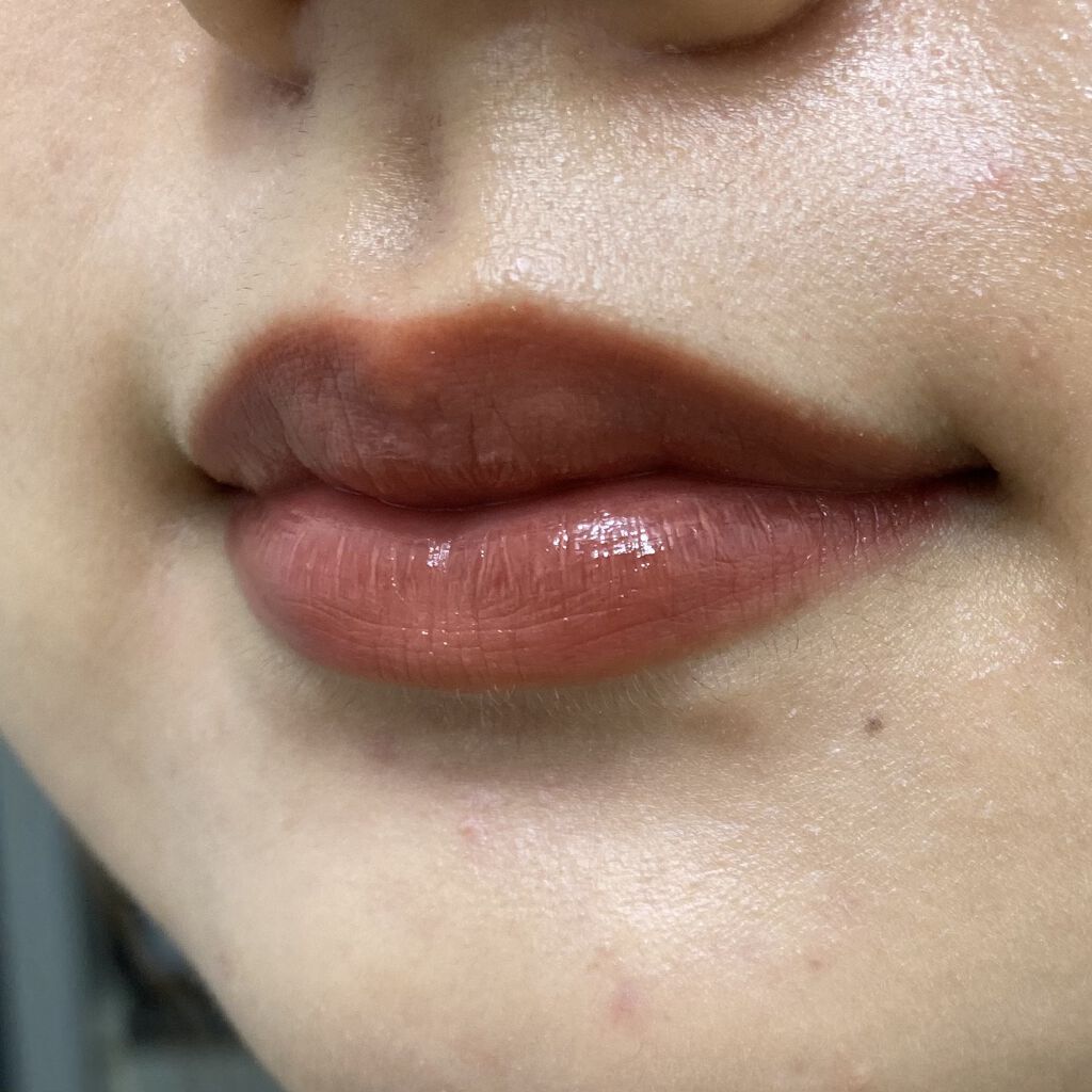 🤎RICAFROSHジューシーリブティント08 レイシ―ビスケ🤎こってりめのテクスチャーで発色がよく、見たままのカラーに発色します😊色持ちもよく、飲食しても落ちにくく、夜までほんのりと色が残っていました✌🏻✨甘すぎない大人なピンクベージュで肌...