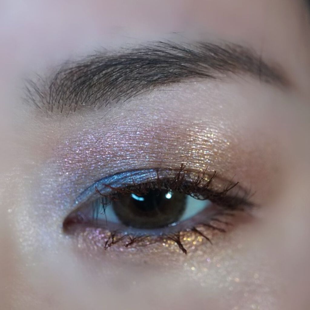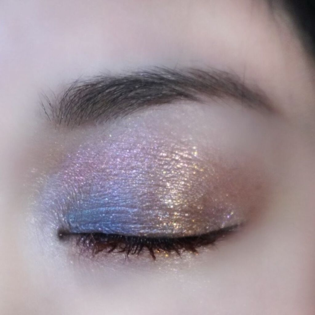 Kaleidosのラメ混じりの黒アイシャドウを使いました!めっちゃ濃いし良いこれ! 私的には深みが出るからafterの写真がお気に入り🖤 カラポのRipple、ベースがピンクなんだけどブルーラメが強めなの可愛かった🥺