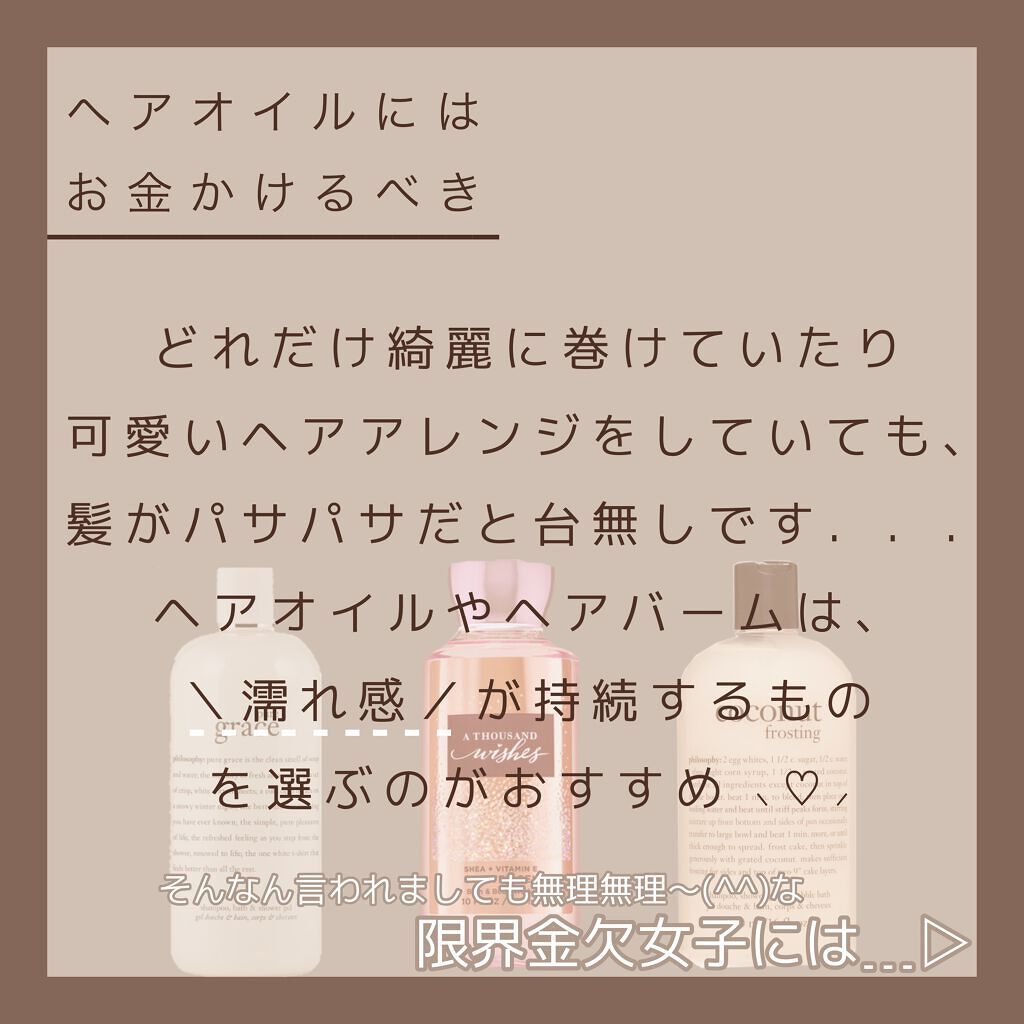 新しいクラスの人たちに「 髪切ってイメチェンした子 」というイメージを与えて、しっかり認知してもらうためです! 絶っっっ対に失敗できないですよね🥺 ある程度のパサつきはヘアオイルやヘアワックス、ヘアバームなどで誤魔化せますよね。 ヘアオイルにはお金かけてもいいでしょ!という結論に至りました、という訳です☺️ しろ特製バームをお教えしたいと思います!!ルシードエル ニュアンスデザインワックスとお好きなヘアオイルを混ぜる!以上です!! ワックスを多めにすればケープ効果が増し、オイルを多めにすれば伸びがよくなります! 毎日ヘアアレンジを変えてみる 私はこれを続けてできるようになって、少し自己肯定感が上がりました☺️