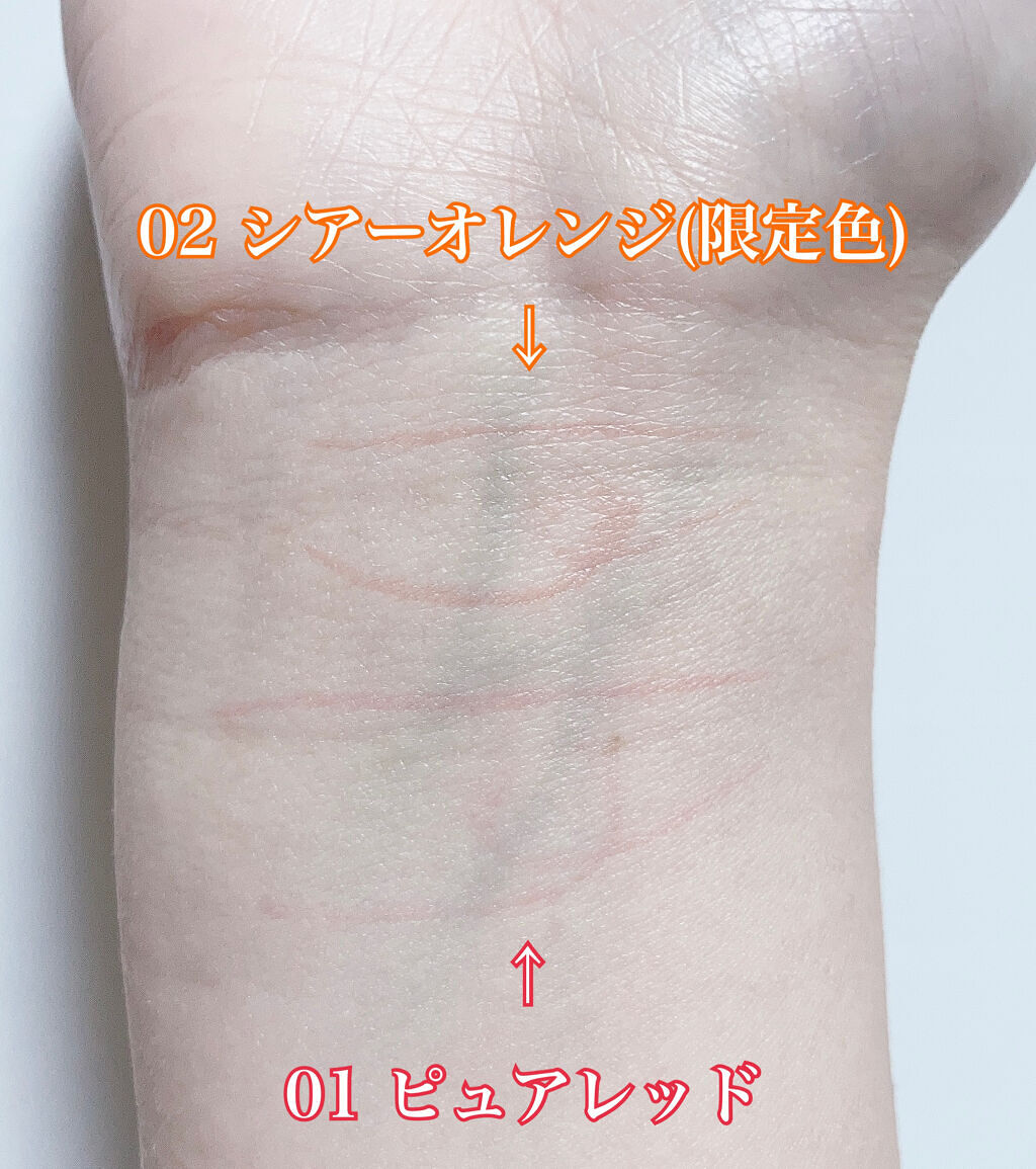 - <01 ピュアレッド> 水、BG、アクリレーツコポリマー、DPG、フェノキシエタノール、メチルパラベン、デヒドロ酢酸Na、エチルパラベン、アスコルビン酸、リンゴ酸、エチルヘキシルグリセリン、カミツレ花エキス、サトザクラ花エキス、チャ葉エキス、赤227、黄4 <02 シアーオレンジ> 水、BG、アクリレーツコポリマー、DPG、フェノキシエタノール、メチルパラベン、デヒドロ酢酸Na、エチルパラベン、アスコルビン酸、リンゴ酸、エチルヘキシルグリセリン、カミツレ花エキス、サトザクラ花エキス、チャ葉エキス、黄4、赤227、青1 <03 アイシーピンク> 水、BG、アクリレーツコポリマー、DPG、フェノキシエタノール、メチルパラベン、デヒドロ酢酸Na、エチルパラベン、カミツレ花エキス、サトザクラ花エキス、アスコルビン酸、リンゴ酸、チャ葉エキス、エチルヘキシルグリセリン、赤227