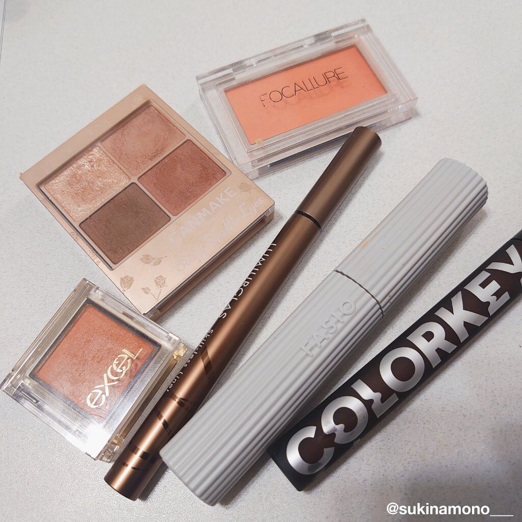 エクセルのアイシャドウは粉質もきめ細かい感じするから仕上がり綺麗になると思う。 CANMAKEのライナーはみんな結構定番に使うくらいスルスル描きやすいよね。 ミルフィーのマスカラはパケがオシャレだし色味もこのピンクブラウンほんと可愛いよ🩷ᩚ