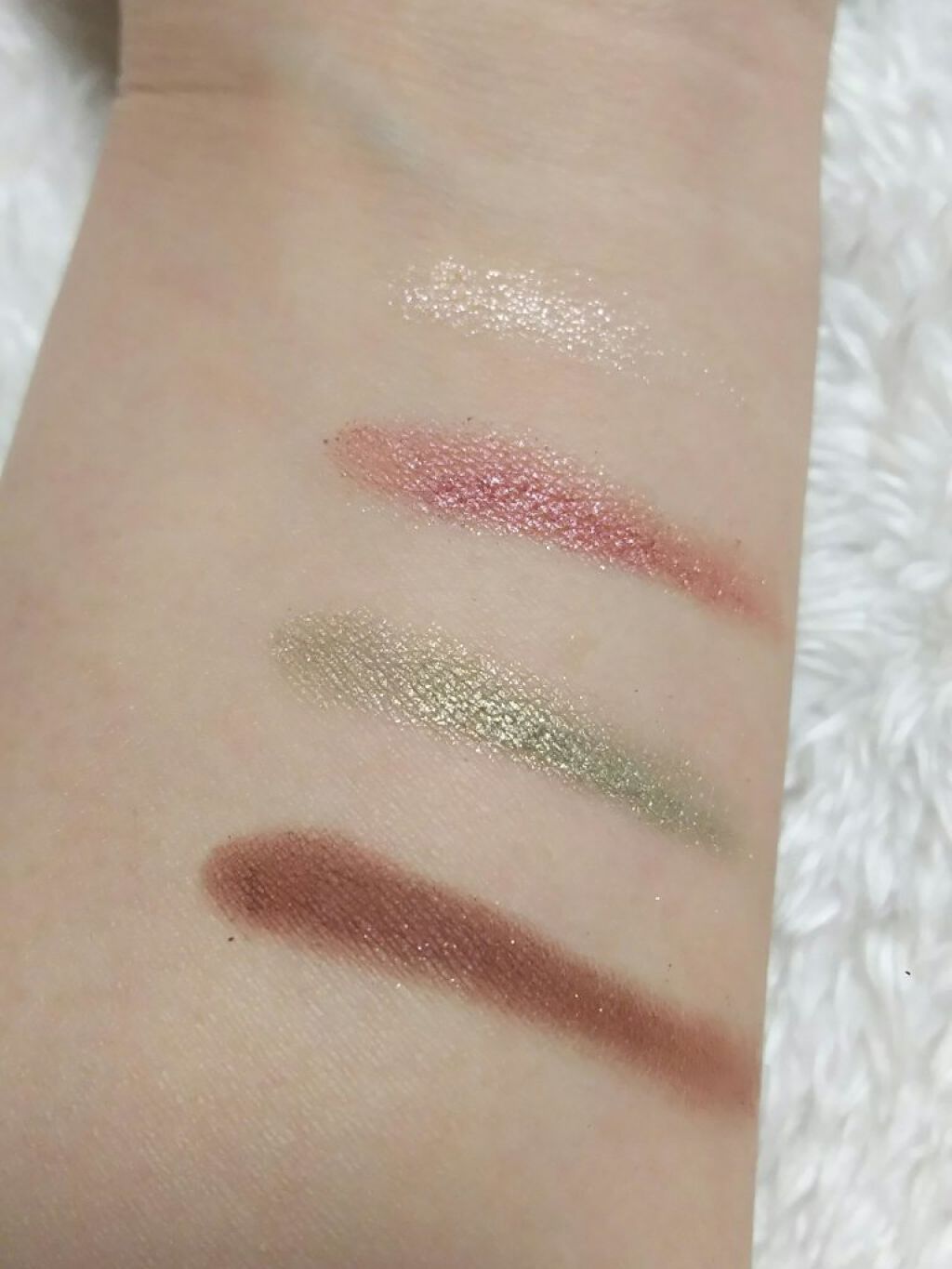 色々なカラーバリエーションがありますが、スタンダードなパレットです。 使いやすい色のセットで、そこまでえげつなく発色するわけではなく、かといって発色しないわけでもないパレットです。 マットの粉はみっしりと詰まっていて、わりとしっかりとした筆じゃないと案外粉が取れないかもしれません。 チップ等が付属していないのはちゃんとした筆を用意してほしいということなのかも……? それはこのキラキラの多色ラメ、粉が緻密で軽すぎて、飛ぶこと…… アイベースを使っていても飛ぶので、結構致命的です。 それでも色はいいし粉もこの値段なら悪くないのでプチプラの中ではおすすめ出来る方です。