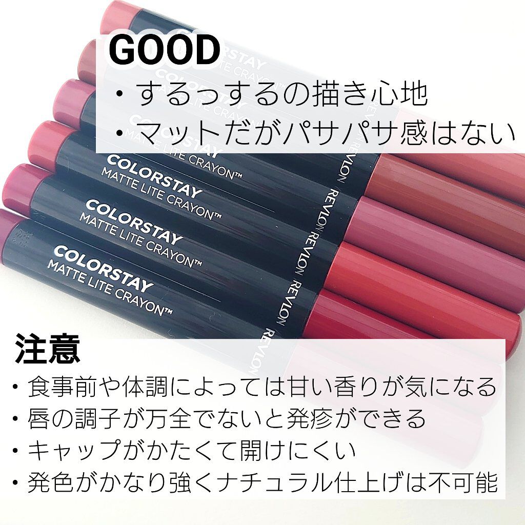 - スルスル描けて、空気のような、軽いつけ心地!超軽*¹!クレヨンリップ 『レブロン カラーステイ マット ライト クレヨン』が登場。 1.するする描けて、ふわっと軽い! まるで天使の羽⁉ 極軽の仕上がりを叶える、ライト インフュージョン コンプレックス*² 処方 2.マスクに、つきにくい! ピタッと密着。サラサラなつけ心地。 3.肌になじむ、自然なマット仕上り! くすみ系カラー&自然なマット質感で、こなれた唇に。 ・ スリムで塗りやすい、クレヨンリップ ・ ほんのりバニラの香り ・ シャープナー付き「くり出し式」 *¹ 従来自社リップスティック製品より30%減の軽さ(同じ塗布方法において) *² コンディショニング成分:マンゴー種子油、シリカ、カプリリルメチコン たくさんのご応募お待ちしております♪