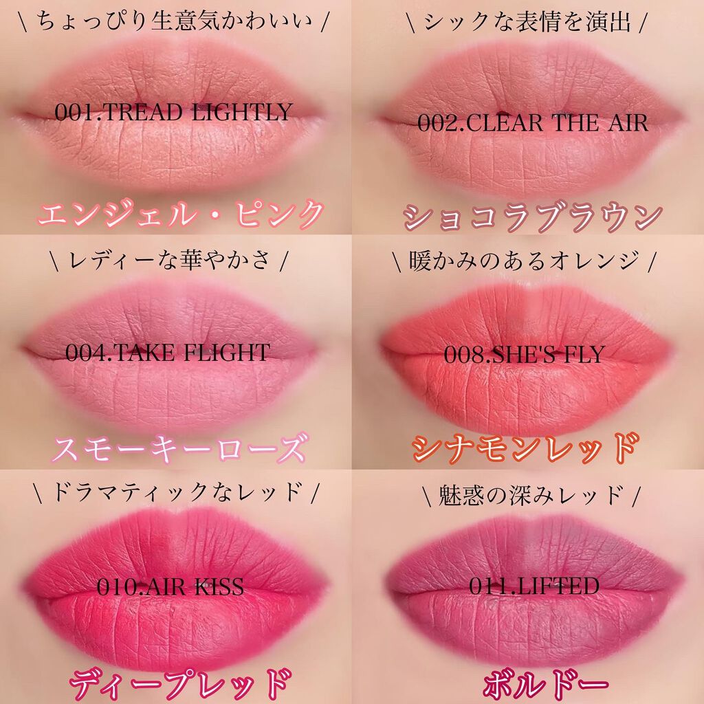 - <001 トレッド ライトリー> イソドデカン、カプリリルメチコン、合成ワックス、リンゴ酸ジイソステアリル、ポリブテン、ベヘン酸セテアリル、シリカ、マンゴー種子油、テトラ(ジ-t-ブチルヒドロキシヒドロケイヒ酸)ペンタエリスリチル、安息香酸ベンジル、香料 [+/-] マイカ、合成フルオロフロゴパイト、硫酸Ba、ロジン、酸化チタン、酸化鉄、マンガンバイオレット、赤201、赤202、黄5、青1 <002 クリア ジ エア> イソドデカン、カプリリルメチコン、合成ワックス、リンゴ酸ジイソステアリル、ポリブテン、ベヘン酸セテアリル、シリカ、マンゴー種子油、テトラ(ジ-t-ブチルヒドロキシヒドロケイヒ酸)ペンタエリスリチル、安息香酸ベンジル、香料 [+/-] マイカ、合成フルオロフロゴパイト、硫酸Ba、ロジン、酸化チタン、酸化鉄、マンガンバイオレット、赤201、赤202、黄5、青1 <003 スフレ オール デイ> イソドデカン、カプリリルメチコン、合成ワックス、リンゴ酸ジイソステアリル、ポリブテン、ベヘン酸セテアリル、シリカ、マンゴー種子油、テトラ(ジ-t-ブチルヒドロキシヒドロケイヒ酸)ペンタエリスリチル、安息香酸ベンジル、香料 [+/-] マイカ、合成フルオロフロゴパイト、硫酸Ba、ロジン、酸化チタン、酸化鉄、マンガンバイオレット、赤201、赤202、黄5、青1 <008 シーズ フライ> イソドデカン、カプリリルメチコン、合成ワックス、リンゴ酸ジイソステアリル、ポリブテン、ベヘン酸セテアリル、シリカ、マンゴー種子油、テトラ(ジ-t-ブチルヒドロキシヒドロケイヒ酸)ペンタエリスリチル、安息香酸ベンジル、香料 [+/-] マイカ、合成フルオロフロゴパイト、硫酸Ba、ロジン、酸化チタン、酸化鉄、マンガンバイオレット、赤201、赤202、黄5、青1 <010 エア キス> イソドデカン、カプリリルメチコン、合成ワックス、リンゴ酸ジイソステアリル、ポリブテン、ベヘン酸セテアリル、シリカ、マンゴー種子油、テトラ(ジ-t-ブチルヒドロキシヒドロケイヒ酸)ペンタエリスリチル、安息香酸ベンジル、香料 [+/-] マイカ、合成フルオロフロゴパイト、硫酸Ba、ロジン、酸化チタン、酸化鉄、マンガンバイオレット、赤201、赤202、黄5、青1 <011 リフテッド> イソドデカン、カプリリルメチコン、合成ワックス、リンゴ酸ジイソステアリル、ポリブテン、ベヘン酸セテアリル、シリカ、マンゴー種子油、テトラ(ジ-t-ブチルヒドロキシヒドロケイヒ酸)ペンタエリスリチル、安息香酸ベンジル、香料 [+/-] マイカ、合成フルオロフロゴパイト、硫酸Ba、ロジン、酸化チタン、酸化鉄、マンガンバイオレット、赤201、赤202、黄5、青1 <004 テイク フライト> イソドデカン、カプリリルメチコン、合成ワックス、リンゴ酸ジイソステアリル、ポリブテン、ベヘン酸セテアリル、シリカ、マンゴー種子油、テトラ(ジ-t-ブチルヒドロキシヒドロケイヒ酸)ペンタエリスリチル、安息香酸ベンジル、香料 [+/-] マイカ、合成フルオロフロゴパイト、硫酸Ba、ロジン、酸化チタン、酸化鉄、マンガンバイオレット、赤201、赤202、黄5、青1