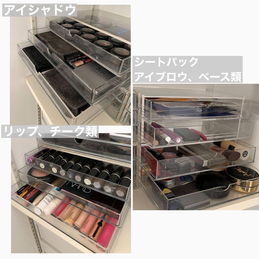 私のコスメ収納はほとんど、無印良品の重なるアクリルケース・横型5段か重なるアクリルケース2段引出・大になります❣️ 見える収納のほうが、朝忙しくてもメイクするときにスムーズに取り出せる事が大きな利点です💯 MACのスモールアイシャドウを1面敷き詰めたり、自分のコレクションが増えて行くのがかなーり嬉しくなります😆❤️❤️