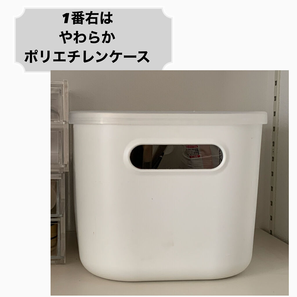 コスメ収納にピッタリ。サイズは約縦15.5✕横32.5✕奥行き19.5cm 持ち手もあって◎ 私はよく使うものはこちらに収納してる カラーは店舗では2色展開。他にグリーン、ピンク、アイボリーはweb限定色として発売されているよ