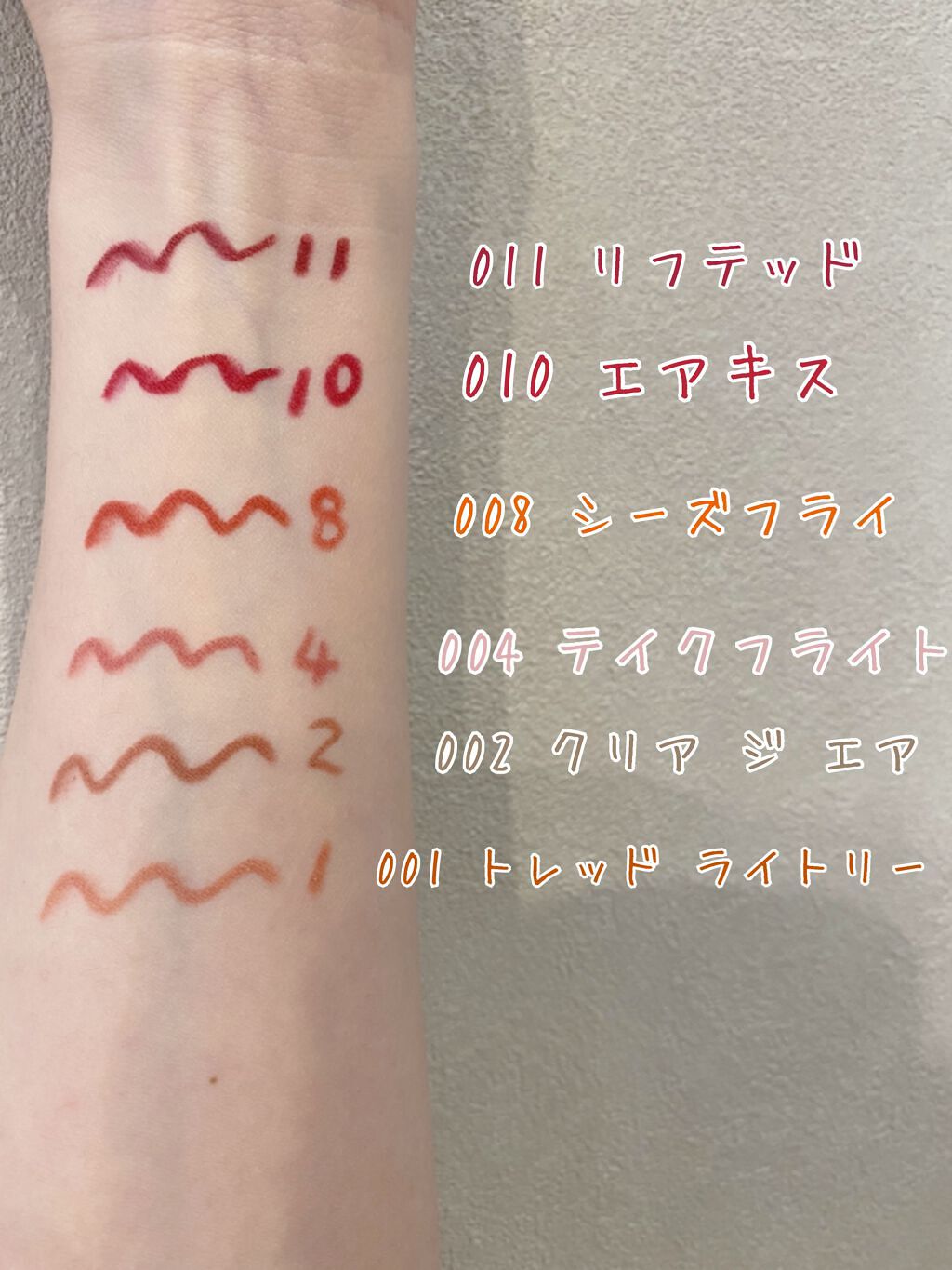 - <001 トレッド ライトリー> イソドデカン、カプリリルメチコン、合成ワックス、リンゴ酸ジイソステアリル、ポリブテン、ベヘン酸セテアリル、シリカ、マンゴー種子油、テトラ(ジ-t-ブチルヒドロキシヒドロケイヒ酸)ペンタエリスリチル、安息香酸ベンジル、香料 [+/-] マイカ、合成フルオロフロゴパイト、硫酸Ba、ロジン、酸化チタン、酸化鉄、マンガンバイオレット、赤201、赤202、黄5、青1 <002 クリア ジ エア> イソドデカン、カプリリルメチコン、合成ワックス、リンゴ酸ジイソステアリル、ポリブテン、ベヘン酸セテアリル、シリカ、マンゴー種子油、テトラ(ジ-t-ブチルヒドロキシヒドロケイヒ酸)ペンタエリスリチル、安息香酸ベンジル、香料 [+/-] マイカ、合成フルオロフロゴパイト、硫酸Ba、ロジン、酸化チタン、酸化鉄、マンガンバイオレット、赤201、赤202、黄5、青1 <003 スフレ オール デイ> イソドデカン、カプリリルメチコン、合成ワックス、リンゴ酸ジイソステアリル、ポリブテン、ベヘン酸セテアリル、シリカ、マンゴー種子油、テトラ(ジ-t-ブチルヒドロキシヒドロケイヒ酸)ペンタエリスリチル、安息香酸ベンジル、香料 [+/-] マイカ、合成フルオロフロゴパイト、硫酸Ba、ロジン、酸化チタン、酸化鉄、マンガンバイオレット、赤201、赤202、黄5、青1 <008 シーズ フライ> イソドデカン、カプリリルメチコン、合成ワックス、リンゴ酸ジイソステアリル、ポリブテン、ベヘン酸セテアリル、シリカ、マンゴー種子油、テトラ(ジ-t-ブチルヒドロキシヒドロケイヒ酸)ペンタエリスリチル、安息香酸ベンジル、香料 [+/-] マイカ、合成フルオロフロゴパイト、硫酸Ba、ロジン、酸化チタン、酸化鉄、マンガンバイオレット、赤201、赤202、黄5、青1 <010 エア キス> イソドデカン、カプリリルメチコン、合成ワックス、リンゴ酸ジイソステアリル、ポリブテン、ベヘン酸セテアリル、シリカ、マンゴー種子油、テトラ(ジ-t-ブチルヒドロキシヒドロケイヒ酸)ペンタエリスリチル、安息香酸ベンジル、香料 [+/-] マイカ、合成フルオロフロゴパイト、硫酸Ba、ロジン、酸化チタン、酸化鉄、マンガンバイオレット、赤201、赤202、黄5、青1 <011 リフテッド> イソドデカン、カプリリルメチコン、合成ワックス、リンゴ酸ジイソステアリル、ポリブテン、ベヘン酸セテアリル、シリカ、マンゴー種子油、テトラ(ジ-t-ブチルヒドロキシヒドロケイヒ酸)ペンタエリスリチル、安息香酸ベンジル、香料 [+/-] マイカ、合成フルオロフロゴパイト、硫酸Ba、ロジン、酸化チタン、酸化鉄、マンガンバイオレット、赤201、赤202、黄5、青1 <004 テイク フライト> イソドデカン、カプリリルメチコン、合成ワックス、リンゴ酸ジイソステアリル、ポリブテン、ベヘン酸セテアリル、シリカ、マンゴー種子油、テトラ(ジ-t-ブチルヒドロキシヒドロケイヒ酸)ペンタエリスリチル、安息香酸ベンジル、香料 [+/-] マイカ、合成フルオロフロゴパイト、硫酸Ba、ロジン、酸化チタン、酸化鉄、マンガンバイオレット、赤201、赤202、黄5、青1