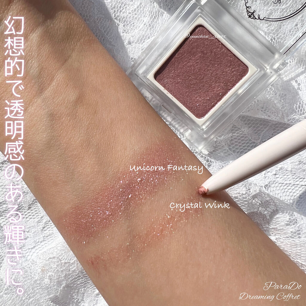 - 限定発売。大人の肌に浮かずになじみ、ロマンティックなきらめきを楽しむ、「ユニコーンカラーの透けラメシャドウ」、「うるみ目アイライナー」、「星降るネイル」の3品セットです。