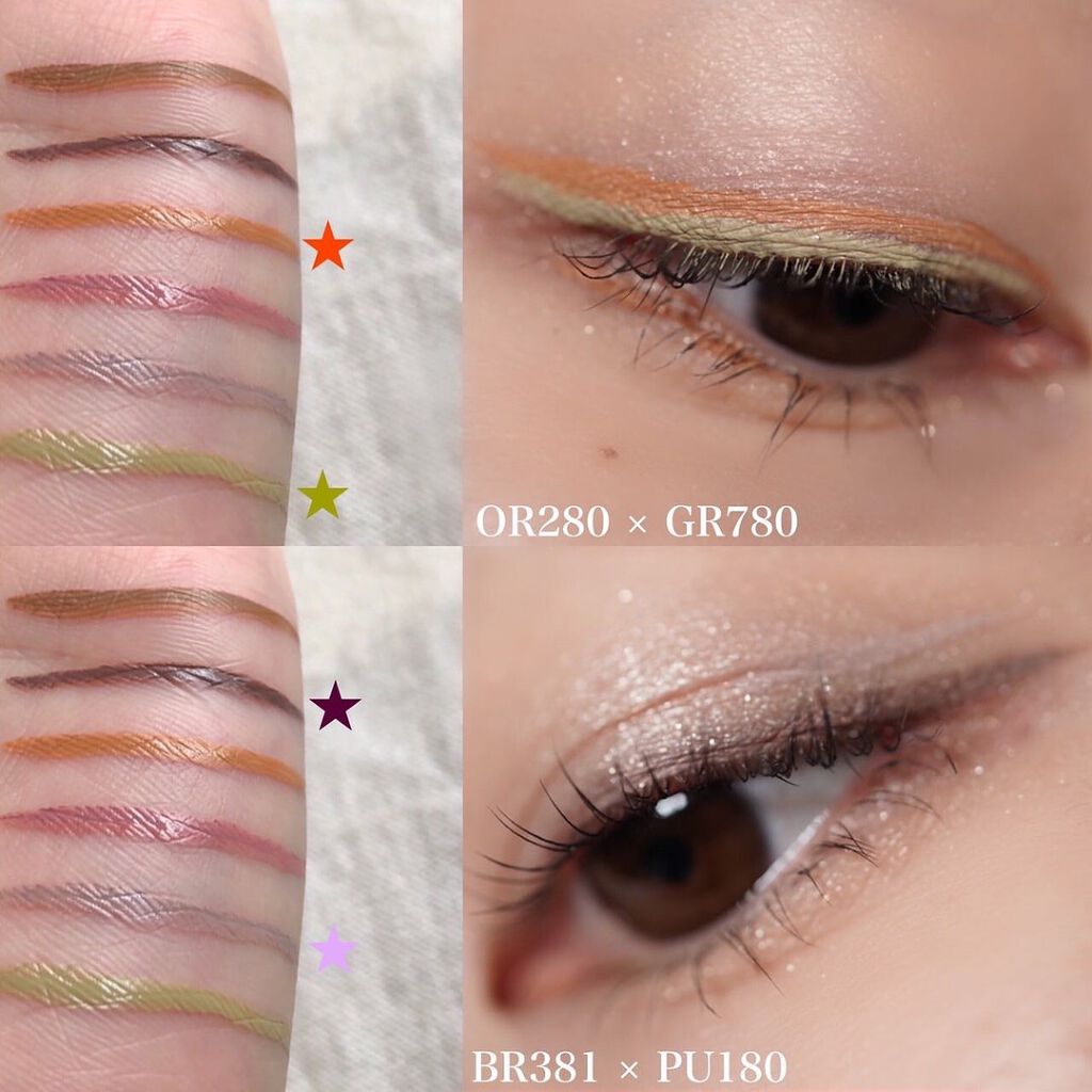 よくパレットのなかで明るいカラーをベースにまぶたに広く塗ることが多いのですが、パール感のあるカラーを避ける🙆♀️! パール感たっぷりの明るいカラーは涙袋に使うぐらい光を集めてぷっくり見せてくれるので、まぶたに広く使うと腫れぼったく見えがち😓 目元を明るくみせてくれたり、次に使うアイシャドウをぼかしやすくしてくれるけど、すっ飛ばしてメインのカラーを塗っちゃう✊🏻❤️🔥 涙袋にはたっぷり塗ってぷっくり見せる🙆♀️💕 シルキースフレアイズのマットタイプはすごく優れているな〜と感じました☺️💗 赤やオレンジなどは、入れすぎると腫れぼったく見えやすいので、見せたいカラーは下まぶた目尻にのせて色をたのしむ♡♡ パール感なしの透けマットだけじゃ物足りない… そう感じさせない華やかなラメが左上に入っているので黒目上と涙袋にのせるとすごく可愛い仕上がりに😍! 厄介な左右差のお陰でマットアイシャドウが好きになりました😌💕
