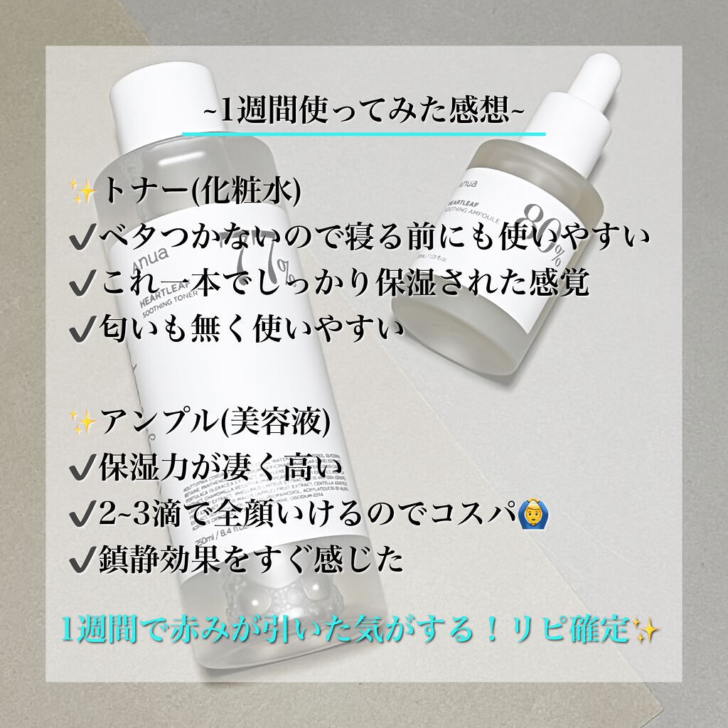 肌質に変化が🥹✨ どちらも鎮静効果抜群のドクダミエキスたっぷりでニキビや肌荒れを抑えてくれる✨ 安心して使える自然由来の肌に優しい成分をたっぷりと詰め込んだ化粧水♡ トナーだけだと保湿力が気になりますがアンプルと合わせて使う事でしっかり保湿でき水分バランスを整えてくれる💗