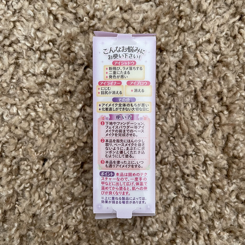 アイシャドウの色持ちや発色UP アイシャドウの前に仕込むだけ! 粉飛びやアイシャドウが二重にたまるのを防止します✨ 時間が経つとにじんだり消えてしまう悩みを解消 米粒くらいの大きさを使います
