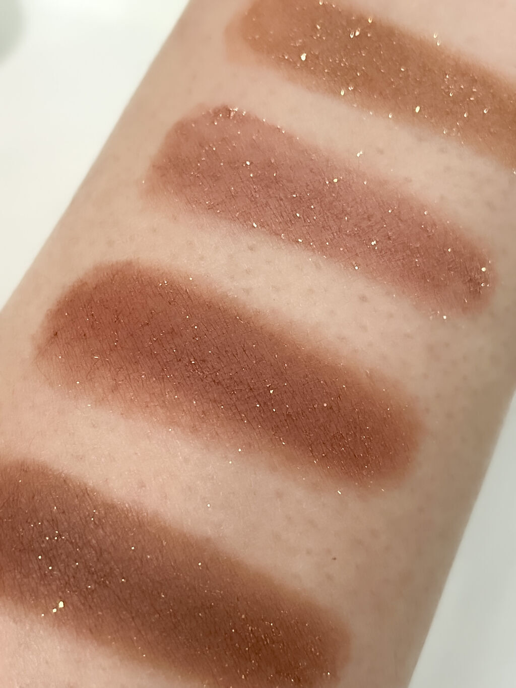 塗り心地は滑らかで発色もよく 唇につけてもベタつきなども感じません。 また、乾燥しやすい方ですが 皮めくれ等もしないので 使いやすい口紅です♡ 見た目のキラキラは 唇に塗っても特に着くわけではなく メタリックの艶が出るカラーです。 指でぼかすと、メタリック感は そんなに目立ちません。 626メタリック フェイムは イエベさん向きの、オレンジ寄りブラウン といった感じがします。 スルーっと溶けるように 唇にのりますので 使用感がとても良いです😌