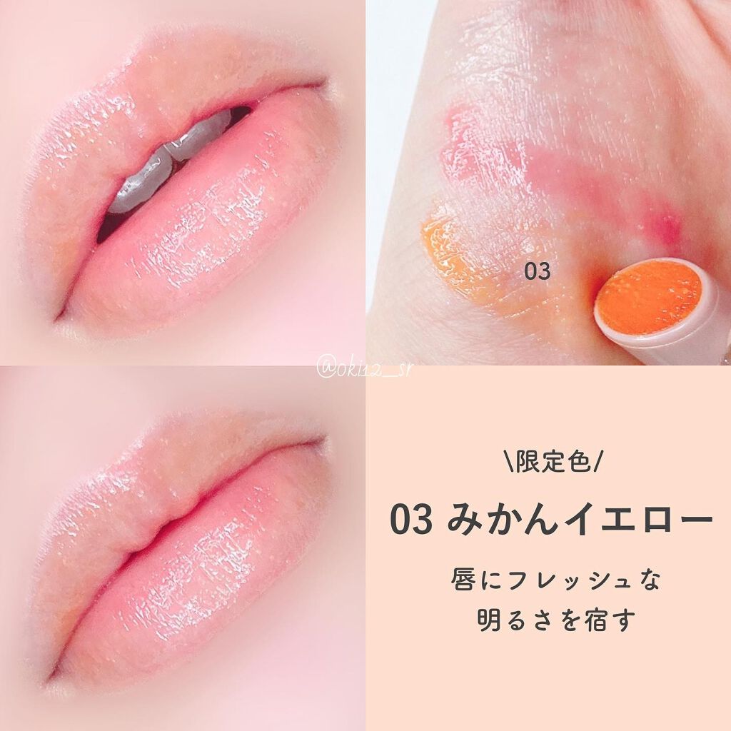 - <01 クリア> 水添ポリイソブテン、ワセリン、オリーブ果実油、ジエチルヘキサン酸ネオペンチルグリコール、スクロース、ポリエチレン、リンゴ酸ジイソステアリル、ジフェニルシロキシフェニルトリメチコン、ジメチルシリル化シリカ、キャンデリラロウ炭化水素、水添ヒマシ油、セスキイソステアリン酸ソルビタン、メントキシプロパンジオール、BG、水、ソメイヨシノ葉エキス、カミツレ花エキス <02 クリアピンク> 水添ポリイソブテン、ワセリン、オリーブ果実油、ジエチルヘキサン酸ネオペンチルグリコール、スクロース、ポリエチレン、リンゴ酸ジイソステアリル、ジフェニルシロキシフェニルトリメチコン、ジメチルシリル化シリカ、キャンデリラロウ炭化水素、水添ヒマシ油、セスキイソステアリン酸ソルビタン、メントキシプロパンジオール、トコフェロール、水酸化Al、BG、水、ソメイヨシノ葉エキス、カミツレ花エキス、酸化チタン、黄4、赤202、酸化鉄 <03 みかんイエロー> 水添ポリイソブテン、ワセリン、オリーブ果実油、ジエチルヘキサン酸ネオペンチルグリコール、スクロース、ポリエチレン、リンゴ酸ジイソステアリル、ジフェニルシロキシフェニルトリメチコン、ジメチルシリル化シリカ、キャンデリラロウ炭化水素、水添ヒマシ油、セスキイソステアリン酸ソルビタン、メントキシプロパンジオール、トコフェロール、BG、水、ソメイヨシノ葉エキス、カミツレ花エキス、黄4、赤202、酸化鉄
