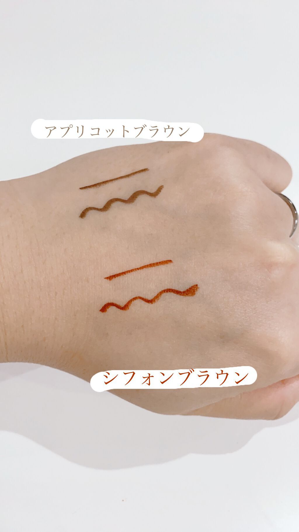 - 筆先までずっとなめらか、目尻で感動するリキッドアイライナー。 必要な量が肌にのる新設計で、まぶたの上をすべるような、滑らかな描き心地。しなやかでコシのある筆が、筆圧のコントロールを容易にし、太いラインも細いラインも思い通りに仕上げます。水、汗、涙に強いウォータープルーフタイプなのに、通常洗顔で簡単オフ。肌に色素が残らない顔料を使用。5種類の美容液成分を従来品の200%配合し、メイクしながら目元ケアまで。 ●ブラウンブラック ※2020年9月12日 バラエティショップ先行発売 ●漆黒ブラック ※2020年12月頃発売予定 ●ナチュラルブラウン ※2020年12月頃発売予定 ●シフォンブラウン 「毎日メイクに透明感と抜け感」 ブラウンでも、グレーでも、ベージュでもないニュアンスカラー。 自然な印影で素の目元を際立て、頑張りすぎない、ふんわりとした目元に。 ●アプリコットブラウン 「じゅわっと血色感。 肌に馴染むおしゃれカラー」 温かみのあるアプリコットがじゅわっと滲む血色感を目元に演出。 肌馴染みが良いので、カラーライナーに抵抗がある方もブラウンの延長線上で楽しめる、使いやすい色味です。 ”ちょっとオシャレ”な空気感を演出するカラー。 ●ピンクショコラ アイライナー 「ピンクが溶け込む濃厚ブラウン」 肌馴染みが良く、目元にじんわり血色感をプラス。 さりげなく女性らしさが加速するようなカラー。 ●ピスタチオラテ (2022年7月29日(金)発売) 「“目尻”に抜け感アクセント」 肌に馴染むのに映える絶妙なグリーン。 トレンドカラーに“くすみ”と“抜け感”をプラスしたまろやかな発色。 ●マスタードブラウン 「“イエロー”が揺れる、大人の洒落色」 (2022年7月29日(金)発売) まるで太陽のような暖かさを感じる新しいブラウン。 ほんのり感じるイエローでメイクが一気に垢抜ける稀有な色。 ●シフォンピンク(2023年2月10日発売) 「ふんわり柔らか"まろみピンク"」 甘くなりすぎない青みニュアンスで目元の透明感UP。 目元を引き締め、ピンクメイクにありがちな腫れぼったさを解消。 ●ミルクカプチーノ(2023年4月21日発売) まろやかな深みの“優しい締め色” どんなメイクにも合わせやすいカラー。 自然な陰影でさりげなく目幅を拡張します。 ●グレーカシミア(2023年10月1日発売) ブラウンがほんのり溶け込んだ、暖色グレー まろやかな発色で、パーソナルカラーを問わず肌に馴染む 目元の陰影になりすまし、抜け感と目力を欲張りに叶える ●ダークフィグ(2024年6月1日発売) するする”なめらか。描きやすいのに、落ちにくい。 クッキリ可愛いほの甘ダークブラウン ●ピーチモカ(2024年8月1日発売) ふわっと自然に盛れる“桃色ブラウン” ほんのり血色感で目元にうるみ感を演出 ●スターダストブラウン(2024年12月11日発売) キラッと繊細に輝く''星屑ブラウン'' 透け感のあるダークブラウンの色味とラメの輝きが、目元に艶のある立体感を演出 ●チャコールモカ(2025年4月10日発売) 目元を締める''深みグレージュ'' 黄みや赤みに偏りすぎない絶妙な色設計で、自然に目元を強調