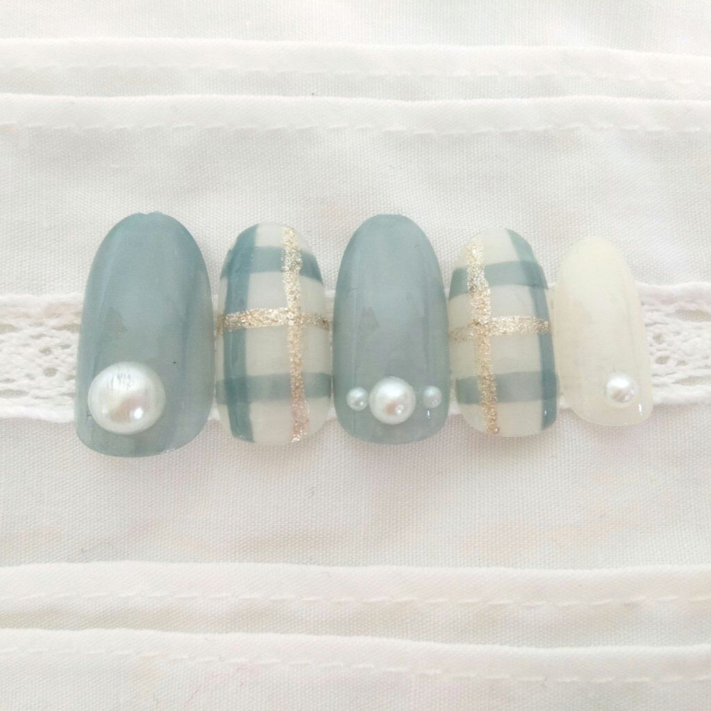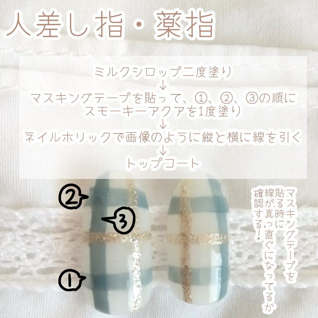【親指・中指】スモーキーアクア二度塗り↓パールストーンを貼る↓トップコート 【人差し指・薬指】ホワイトシロップ二度塗り↓マスキングテープを貼って、横、横、縦の順番にスモーキーアクアを一度塗り(マスキングテープを貼る時に、線がまっすぐになってるか確認する!)↓ネイルホリックで縦と横に線を引く(私はフリーハンドで引きましたが曲がるのが嫌だったらマスキングテープを貼るといいです〇)↓トップコート 【小指】ホワイトシロップ二度塗り↓パールストーンを貼る↓トップコート