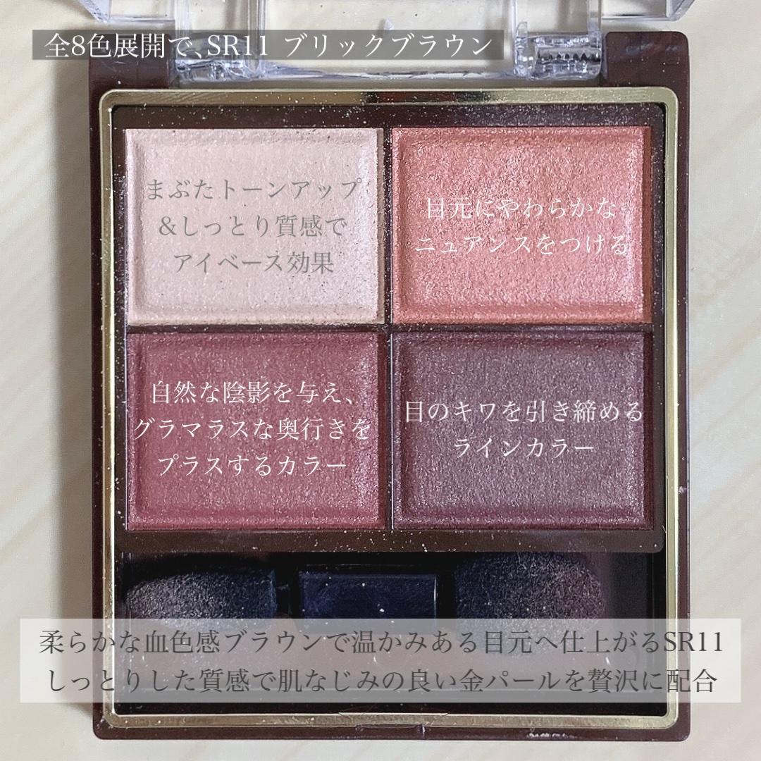 - 【ポイント】 1.失敗しらずのブラウンベースの4色パレット!簡単にグラデーションを実現。 2.しっとりリッチな質感!するする伸びて粉飛びもなく目元の乾燥も防ぎます。 3.上品な輝きの繊維パール+金パールを贅沢に配合。ギラつかない大人のツヤを演出。 <SR01'23・SR03'23・SR06'23・SR11'23(限定デザイン)> 実力派グラデアイシャドウからデジタルアートをあしらった限定デザイン登場。 しっとりリッチな密着感。肌のなじみの良い実力派グラデアイシャドウ。