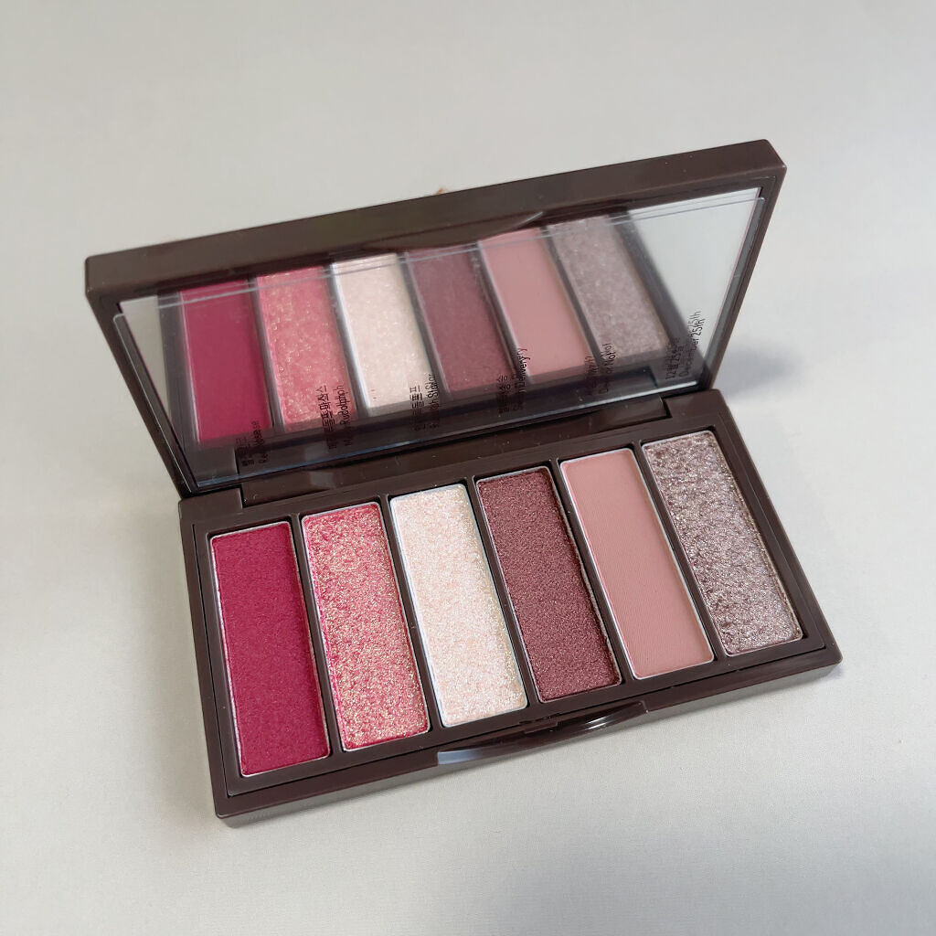 01はブルベ向け02がイエベ向けの捨て色なし6色 大きめの鏡とチップがついていて便利✨ 01 COOKYオントップ ピンクパープルカラー。 紫陽花、ライラックを連想させるようなパレットで これからの季節にも合うかなと🎵 02 ニューイヤーパーティー ゴールドブラウンカラー。 よく使っているシャドウパレット♪ 使いやすい色でおすすめ⭕️ ふんわり発色でしっとりさらさらな質感。 このパレット、使いやすくて急いでる時や迷った時にとてもお世話になってます👍