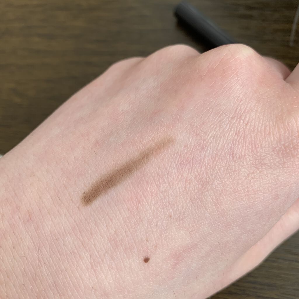 筆ペンタイプなので、描きやすいのと、太さの調節をしやすいのがいいですね。 ちょっと太めにするといいかも。 すこし手に落書きしてみましたが、スルスル描けるし、細かいところも描きやすいです。 ちょっと触ったりこすったりした程度では落ちないのもいいです。 オフも簡単です。まぶたに残ることもないです。 ブラウンブラックということで、定番の色で使い勝手も良さそうです。