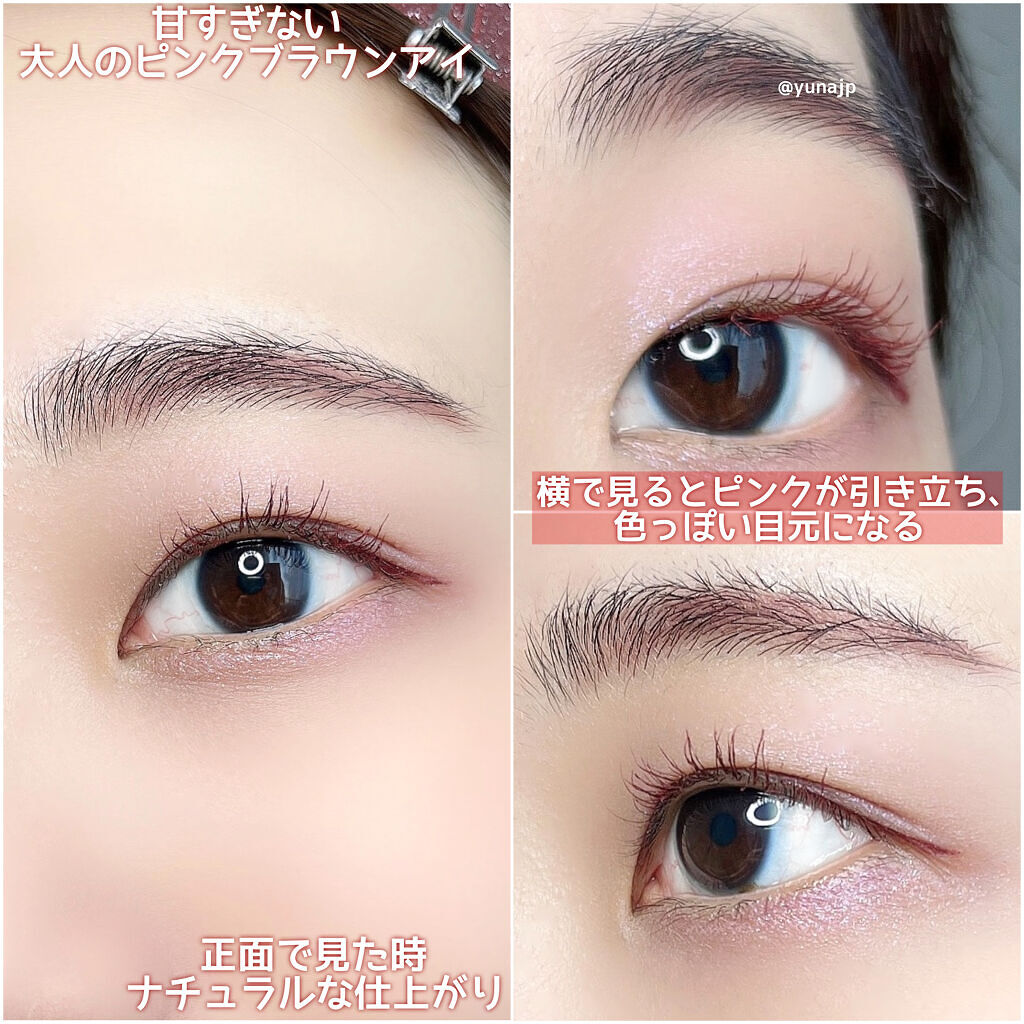 トーンアップアイシャドウの既存色はブラウン系が多くて、もっとピンクっぽい色ほしいなーと願ったら早速この可愛らしいピンクブラウンが発売されました♡ 初めてほしい配色が出たので買ってみたら一番驚いたのはやはり粉質ですね! プチプラと思えないしっとりした粉質で肌に塗ると綺麗に密着します。 パレットの見た目はピンクですが、実際の発色は甘くなりすぎず年齢を問わず使えるくすみピンクブラウンになります。