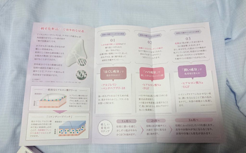 - “刺す化粧品シリーズ”の、眉間の年齢サインにアプローチをする眉間専用商品です。 刺す化粧品の一番の特徴は、針の形状。美容成分そのものを針状に固め、肌に直接突き刺すことで、ダイレクトに角質層まで美容成分を届けることができる画期的な美容法です。 針の成分には、しかめ面や険しい表情などで凝り固まった眉間の折れグセにアプローチする「ほぐし成分*¹」と、肌の乾燥やハリ不足を対策する「ヒアルロン酸*²」など、眉間の深い悩みにアプローチをする美容成分をたっぷりと配合。 パッチは眉間部分に合わせた形状で、粘着部分はハイドロコロイド材質を使用しているため、密着性は高いですが肌への刺激が起きにくく、就寝中もご使用いただけます。 週に2回貼って寝て、手強い眉間の年齢サインをケアします。 *¹アセチルヘキサペプチド-3、ペンタペプチド-18 (肌を柔らげる成分) *²ハリやうるおいを与える成分