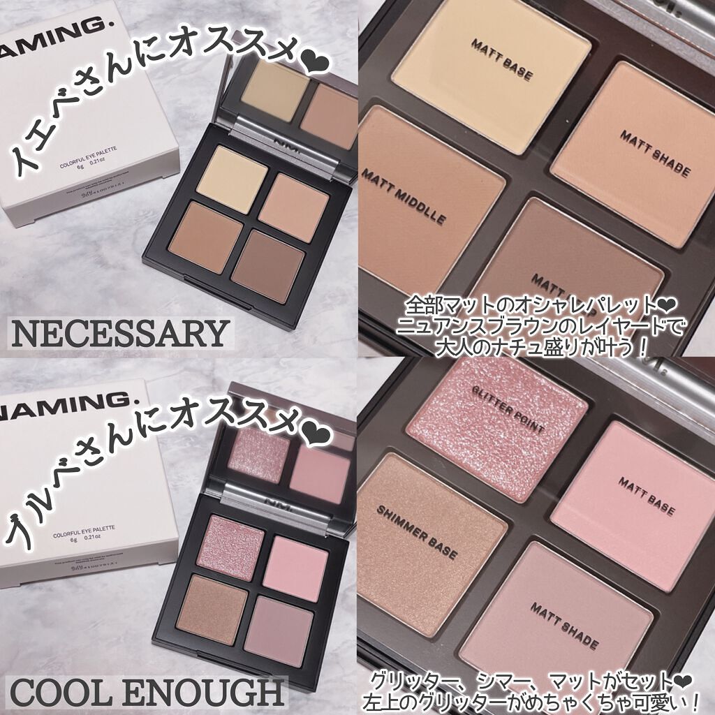《NAMING.新作》ニュアンス大人パレット🤍NAMING.の新作パレットは淡いカラーでシンプルなのにスタイリッシュな仕上がり✨▶︎COLORFULEYEPALETTEさらっとした粉質で、ナチュラルな発色😌しっかり発色させたい方はチップや指を...