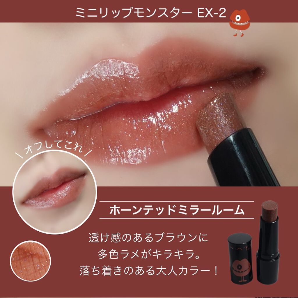 - 落ちにくさも美発色もよくばりたい、つけたての色が長時間持続する人気の口紅リップモンスター。 唇から蒸発する水分を活用して密着ジェル膜に変化する独自技術※で、つけたての色が長時間持続。 高発色&保湿。 ※当社独自の色持ち技術 ■花火のようにまぶしくきらめく 繊細なラメが際立つ限定色 EX-6 ピンクカラー×青ラメ【ロケット花火流星群】 EX-7 オレンジカラー×黄&緑ラメ【100万発の線香花火】 EX-8 レッドカラー×緑ラメ【打ち上げ花火ブランコ】 ■深みレッド系カラーの限定色 EX-9 戦慄の喜笑 (限定色) EX-10 狂気の怒号 (限定色) 【2025クリスマスコフレ】 落ちにくいリップモンスターから、唇の血色感を底上げする ホリデーシーズン限定の熱感ニュアンスベージュ系カラー登場。 EX-11 紅煙宿る贈り物(限定色):ボルドーベージュ系 EX-12 盗まれた1224mの星光(限定色):キャメルベージュ系