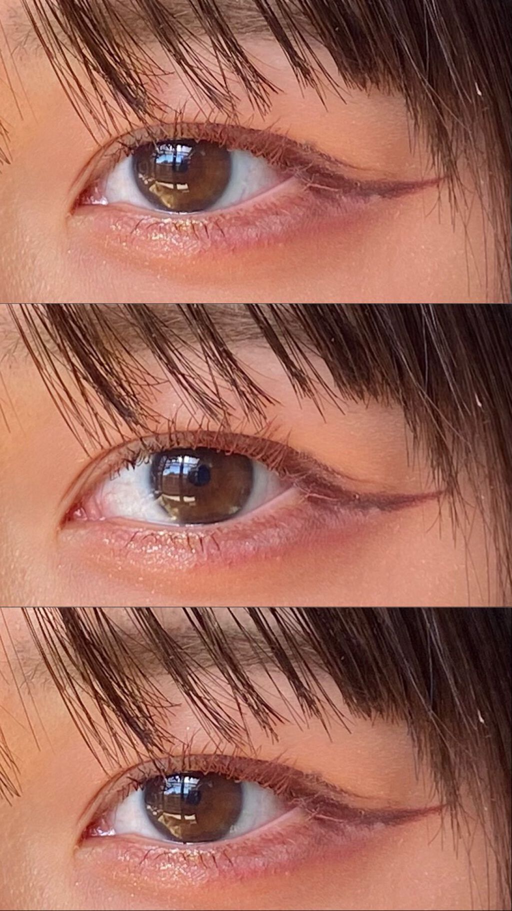 【使った商品】・デジャヴュの「密着アイライナー」ショート筆リキッド"ミディアムブラウン" 1. 自分のなりたい理想の目の形を把握する 2. 理想の形のアイラインの終点の場所に点を描く 3. 描いた点にめがけて黒目の端から描いていく 1. 点を描くことが失敗しないコツ‼️ 絶対忘れないで!! 2. 目頭からアイラインを描くときつい印象を与えるので目尻側からスタートしよう‼️ 黒目の下と同じ高さを意識する‼️ 黒目の半分の高さを意識する‼️ 目尻までラインを引いたら、少し上向きにラインを引く