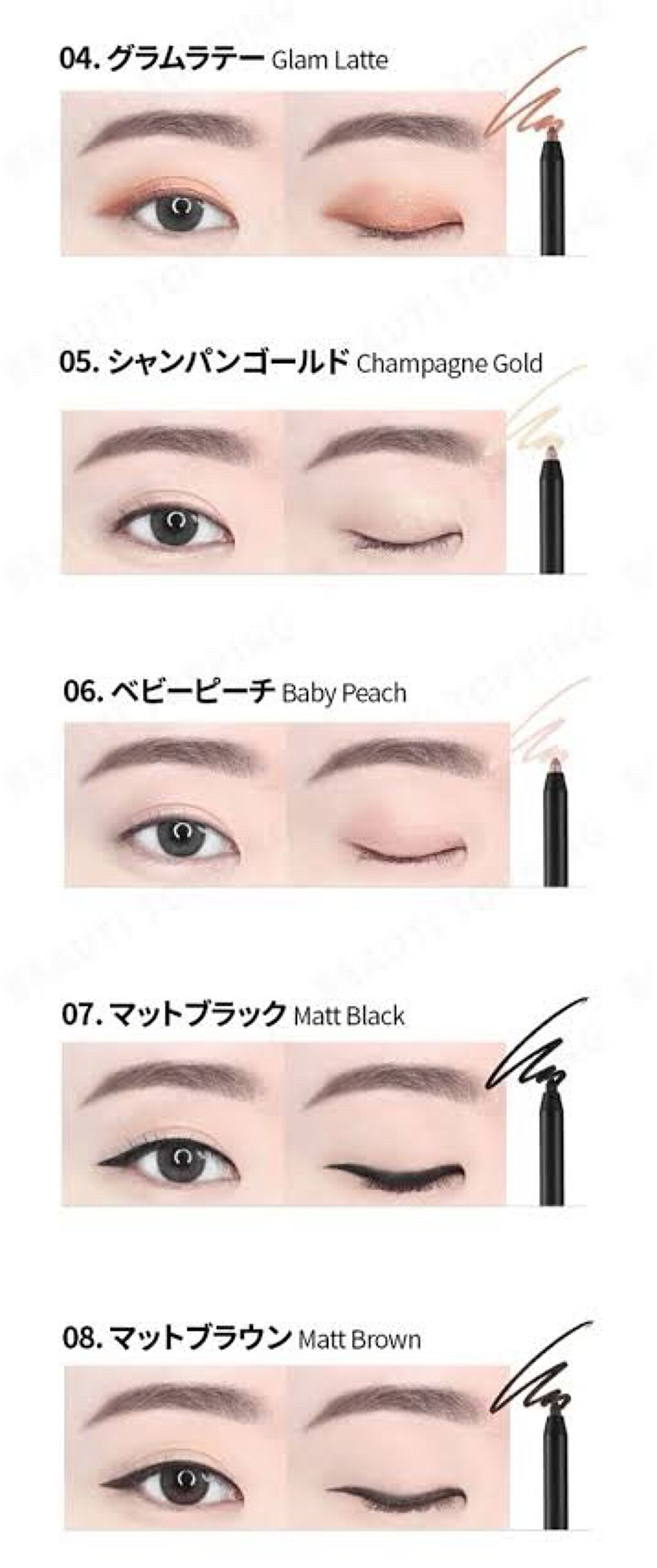 - <01 MIDNIGHT BLACK> トリメチルシロキシケイ酸、シクロペンタシロキサン、酸化鉄、ホウケイ酸(Ca/チタン),イソドデカン、ポリエチレン、合成ワックス、セレシン,トリイソステアリン酸ポリグリセリル-2、酸化チタン、ポリイソブテン、酸化スズ <02 CHIC NAVY> トリメチルシロキシケイ酸、シクロペンタシロキサン、酸化鉄、イソドデカン,ポリエチレン、酸化チタン、マイカ、合成ワックス,ホウケイ酸(Ca/Na)、セレシン、シリカ,トリイソステアリン酸ポリグリセリル-2、ポリイソブテン、コンジョウ <03 CINNAMON MOCHA> トリメチルシロキシケイ酸、シクロペンタシロキサン、イソドデカン、マイカ,酸化鉄、ポリエチレン、合成ワックス、酸化チタン、セレシン、ホウケイ酸(Ca/チタン),ホウケイ酸(Ca/Al)、トリイソステアリン酸ポリグリセリル-2、ポリイソブテン、シリカ、酸化スズ <04 GLAM LATTE> トリメチルシロキシケイ酸、シクロペンタシロキサン、マイカ、イソドデカン,ポリエチレン、酸化鉄、合成フルオロフロゴパイト、合成ワックス,ホウケイ酸(Ca/Al)、酸化チタン、セレシン,トリイソステアリン酸ポリグリセリル-2、シリカ、ポリイソブテン、酸化スズ <05 CHAMPAGNE GOLD> トリメチルシロキシケイ酸、シクロペンタシロキサン、マイカ、酸化チタン,イソドデカン、ポリエチレン、合成フルオロフロゴパイト、合成ワックス,セレシン、トリイソステアリン酸ポリグリセリル-2、酸化鉄、ポリイソブテン、カルミン <06 BABY PEACH> トリメチルシロキシケイ酸、シクロペンタシロキサン、マイカ、酸化チタン,イソドデカン、ポリエチレン、合成フルオロフロゴパイト、合成ワックス,セレシン、トリイソステアリン酸ポリグリセリル-2、酸化鉄、ポリイソブテン、カルミン <07 MATTE BLACK> 酸化鉄 (CI 77499)、トリメチルシロキシケイ酸、シクロペンタシロキサン、イソドデカン、ポリエチレン、合成ワックス、セレシン、マイカ (CI 77019)、キャンデリラロウ、シクロペンタシロキサン(アクリレーツ/メタクリル酸ポリトリメチルシロキシ)コポリマー、ポリイソブテン、ポリヒドロキシステアリン酸、レシチン、パルミチン酸エチルヘキシル、イソステアリン酸、ミリスチン酸イソプロピル、酢酸トコフェロール、カプリリルグリコール、ジメチコン、ポリリシノレイン酸ポリグリセリル-3 <08 MATTE BROWN> トリメチルシロキシケイ酸、シクロペンタシロキサン、酸化鉄 (CI 77499)、イソドデカン、ポリエチレン、酸化鉄 (CI 77491)、合成ワックス、酸化鉄 (CI 77492)、セレシン、マイカ (CI 77019)、キャンデリラロウ、シクロペンタシロキサン(アクリレーツ/メタクリル酸ポリトリメチルシロキシ)コポリマー、 ポリイソブテン、ポリヒドロキシステアリン酸、レシチン、パルミチン酸エチルヘキシル、イソステアリン酸、ミリスチン酸イソプロピル、酢酸トコフェロール、カプリリルグリコール、ジメチコン、ポリリシノレイン酸ポリグリセリル-3 <09 CHOCO BROWN> トリメチルシロキシケイ酸、シクロペンタシロキサン、酸化鉄 (CI 77491)、イソドデカン、マイカ (CI 77019)、ポリエチレン、酸化鉄 (CI 77499)、酸化鉄 (CI 77492)、合成ワックス、セレシン、酸化チタン (CI 77891)、キャンデリラロウ、合成フルオロフロゴパイト、ポリイソブテン、赤202 (CI 15850:1)、ポリヒドロキシステアリン酸、レシチン、パルミチン酸エチルヘキシル、イソステアリン酸、ミリスチン酸イソプロピル、ジメチコン、酢酸トコフェロール、カプリリルグリコール、ポリリシノレイン酸ポリグリセリル-3 <10 DARK ROSE> トリメチルシロキシケイ酸、シクロペンタシロキサン、イソドデカン、酸化鉄 (CI 77491)、マイカ (CI 77019)、ポリエチレン、ホウケイ酸(Ca/チタン)、合成ワックス、酸化鉄 (CI 77499)、酸化チタン (CI 77891)、セレシン、酸化鉄 (CI 77492)、キャンデリラロウ、赤202 (CI 15850:1)、酸化スズ (CI 77861)、ポリイソブテン、シクロペンタシロキサン(アクリレーツ/メタクリル酸ポリトリメチルシロキシ)コポリマー、ポリヒドロキシステアリン酸、レシチン、パルミチン酸エチルヘキシル、イソステアリン酸、ミリスチン酸イソプロピル、酢酸トコフェロール、カプリリルグリコール、ポリリシノレイン酸ポリグリセリル-3 <11 CORAL BRICK> トリメチルシロキシケイ酸、シクロペンタシロキサン、マイカ(CI 77019)、合成ワックス、メチルトリメチコン、合成フルオロフロゴパイト、酸化鉄(CI 77491)、セレシン、酸化チタン(CI 77891)、ホウケイ酸(Ca/Al)、キャンデリラロウ、ポリイソブテン、ポリヒドロキシステアリン酸、ジメチコン、レシチン、パルミチン酸エチルヘキシル、イソステアリン酸、ミリスチン酸イソプロピル、カプリル酸グリセリル、カプリリルグリコール、ポリリシノレイン酸ポリグリセリル-3、酸化スズ(CI 77861)